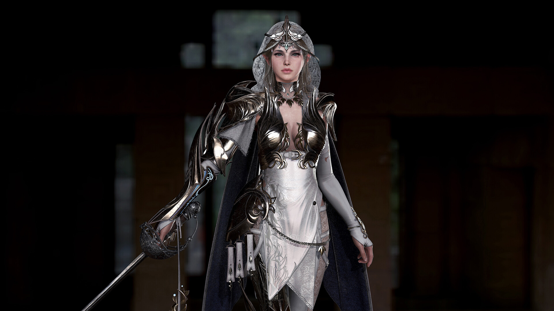 Description: A woman dressed in a costume with a sword and armor on a runway with a dark background and a black background.