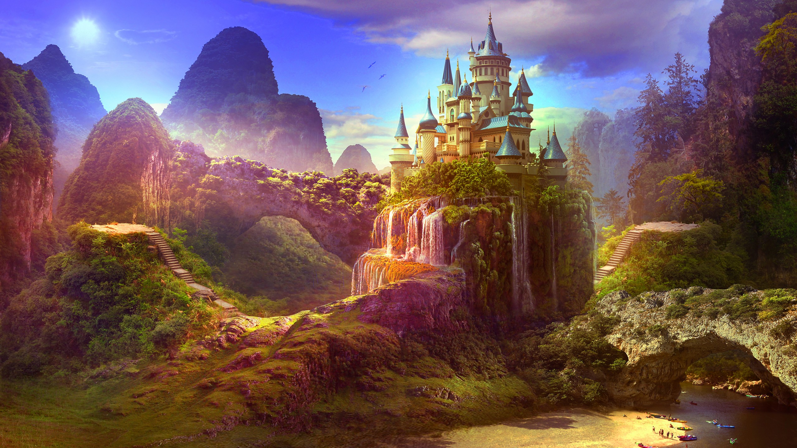 Description: A fantasy castle surrounded by mountains and a river in the foreground is a bridge and a bridge is in the background.