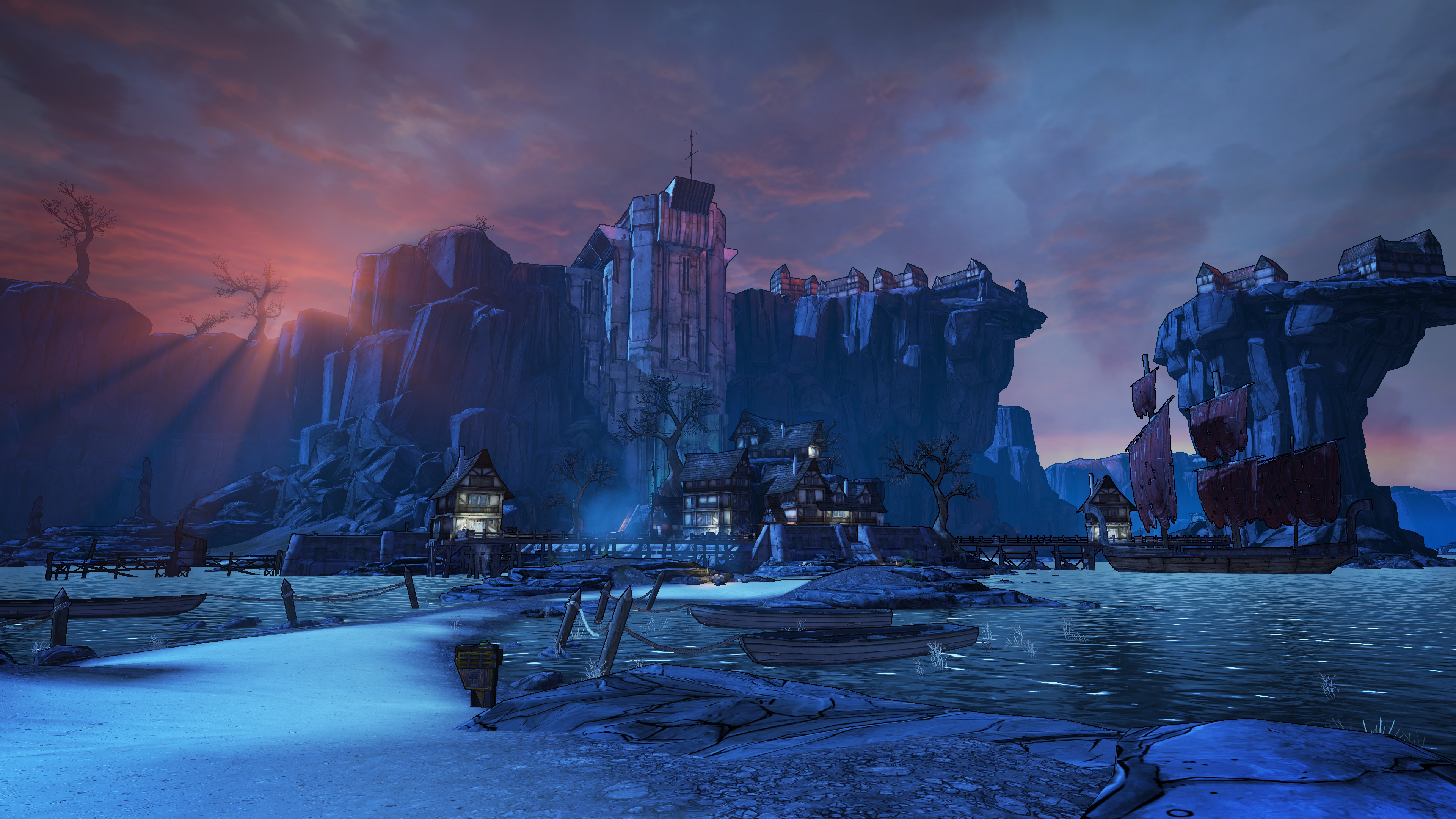Description: A computer generated image of a fantasy city at night with a red sky and a mountain in the background.