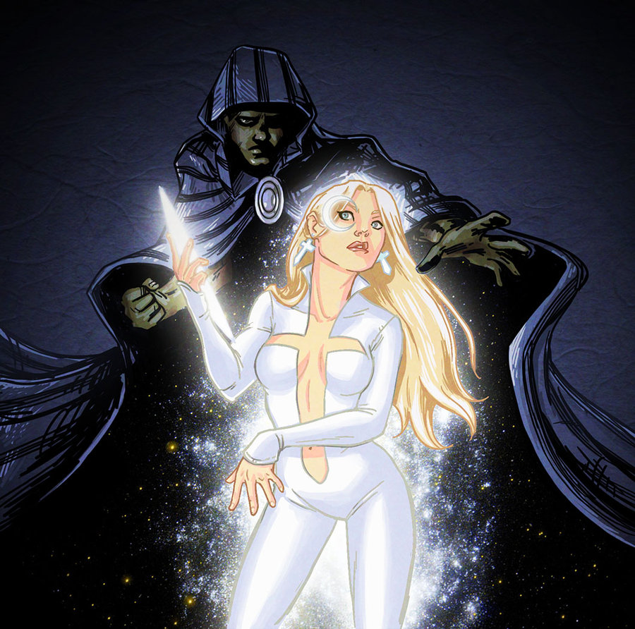 Description: A cartoon of a woman in a white suit and a man in a black suit with a sword in their hand.