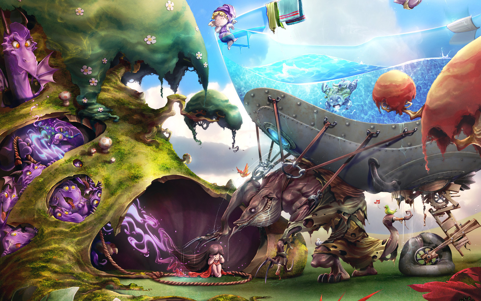 Description: A painting of a group of people in a field with a boat in the background and a tree in the foreground.