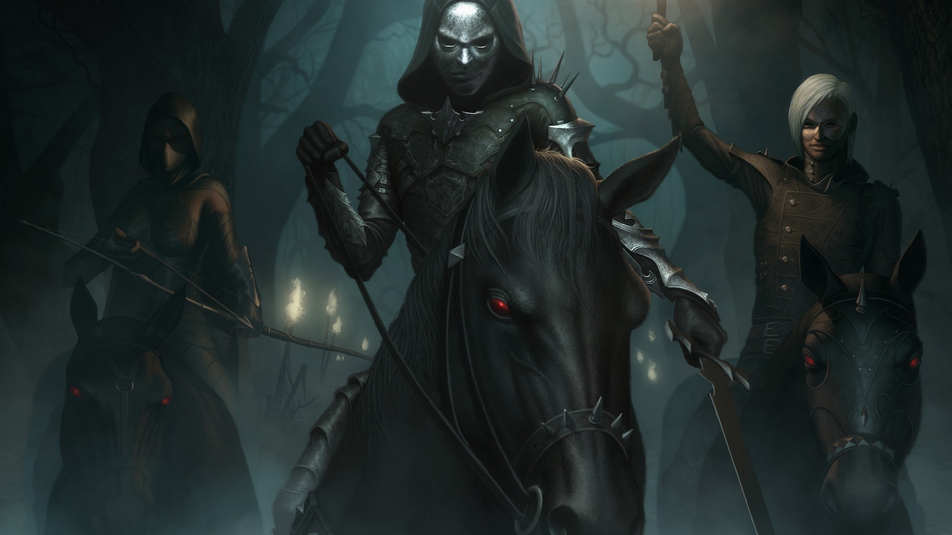 Description: A group of people in costumes riding horses in the woods with a light on their head and a horse with a sword in its hand.