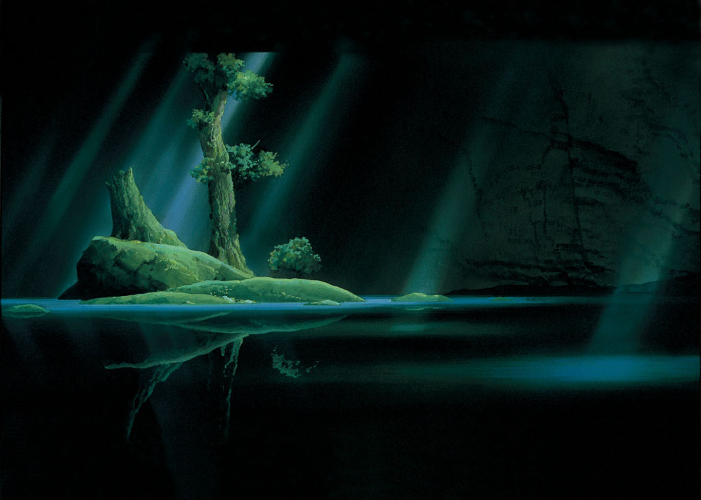 Description: A painting of a tree in the middle of a lake with a rock in the middle of the water.