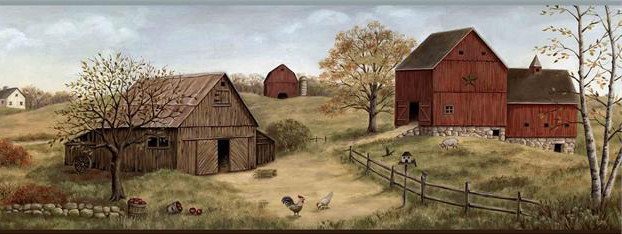 Description: A painting of a farm scene with chickens and a barn in the background with a fence and a tree.