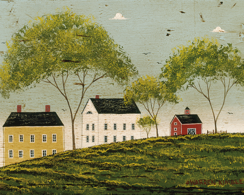 Description: A painting of a farm with a red house and a white house on a hill with trees and birds flying overhead.