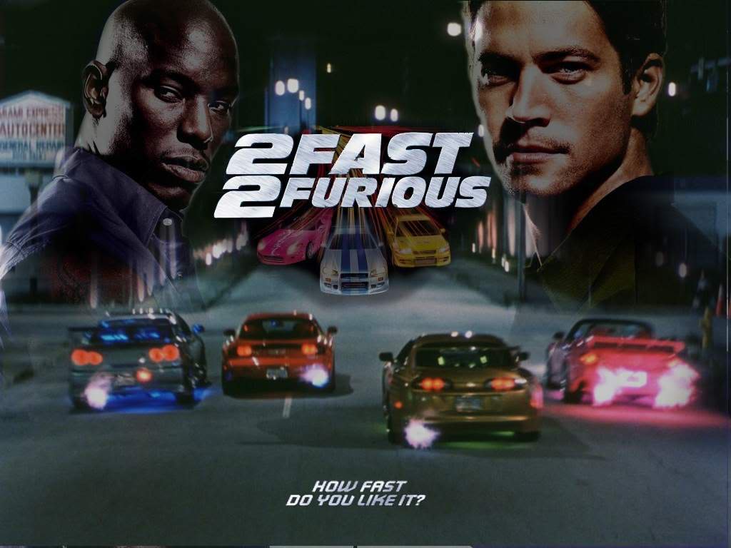 Description: A movie poster for fast 2 fast and the furious with two men in the background and a car in the foreground.