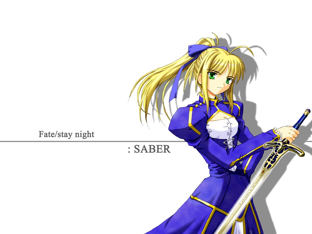 Description: A woman in a blue dress holding a sword and a white background with a caption that says fate / stay right saber.