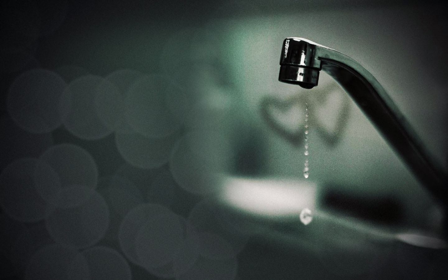 Description: A faucet with water running from it in a bathroom sink with a blurry background of circles.