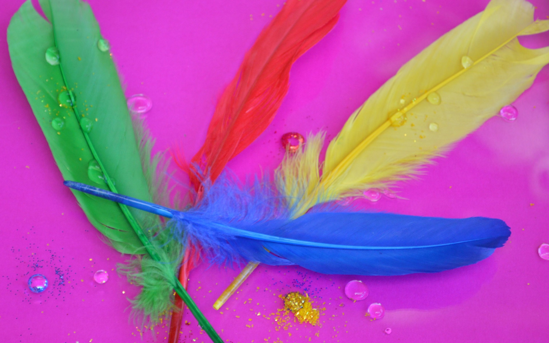 Description: Three feathers on a pink surface with water droplets on them and a yellow stick with a blue tip and a red tip.