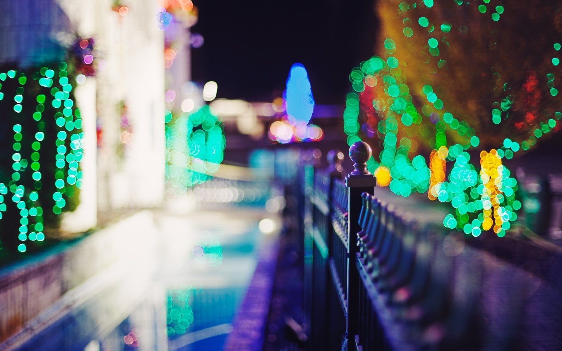 Description: A fence with lights on it and a building in the background at night time with a reflection of the fence.
