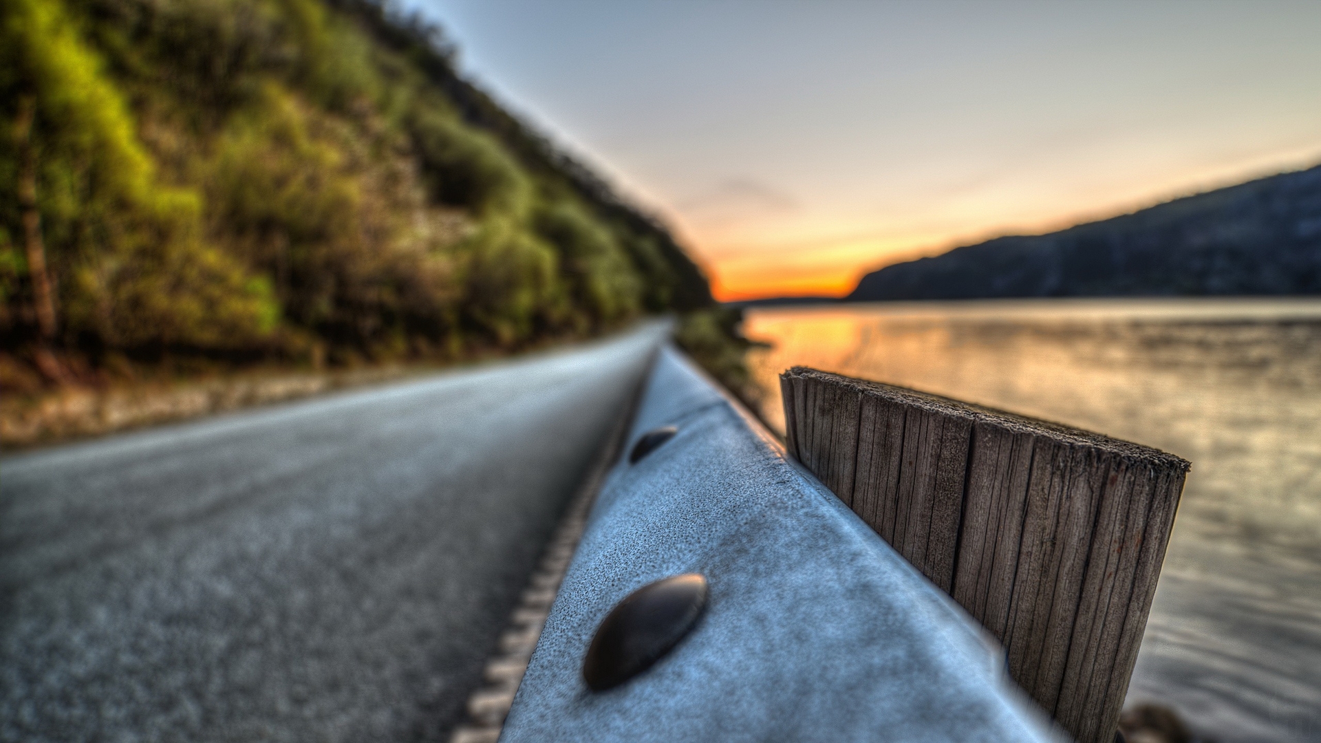 Description: A wooden fence next to a body of water at sunset or sunset time with a mountain in the background.