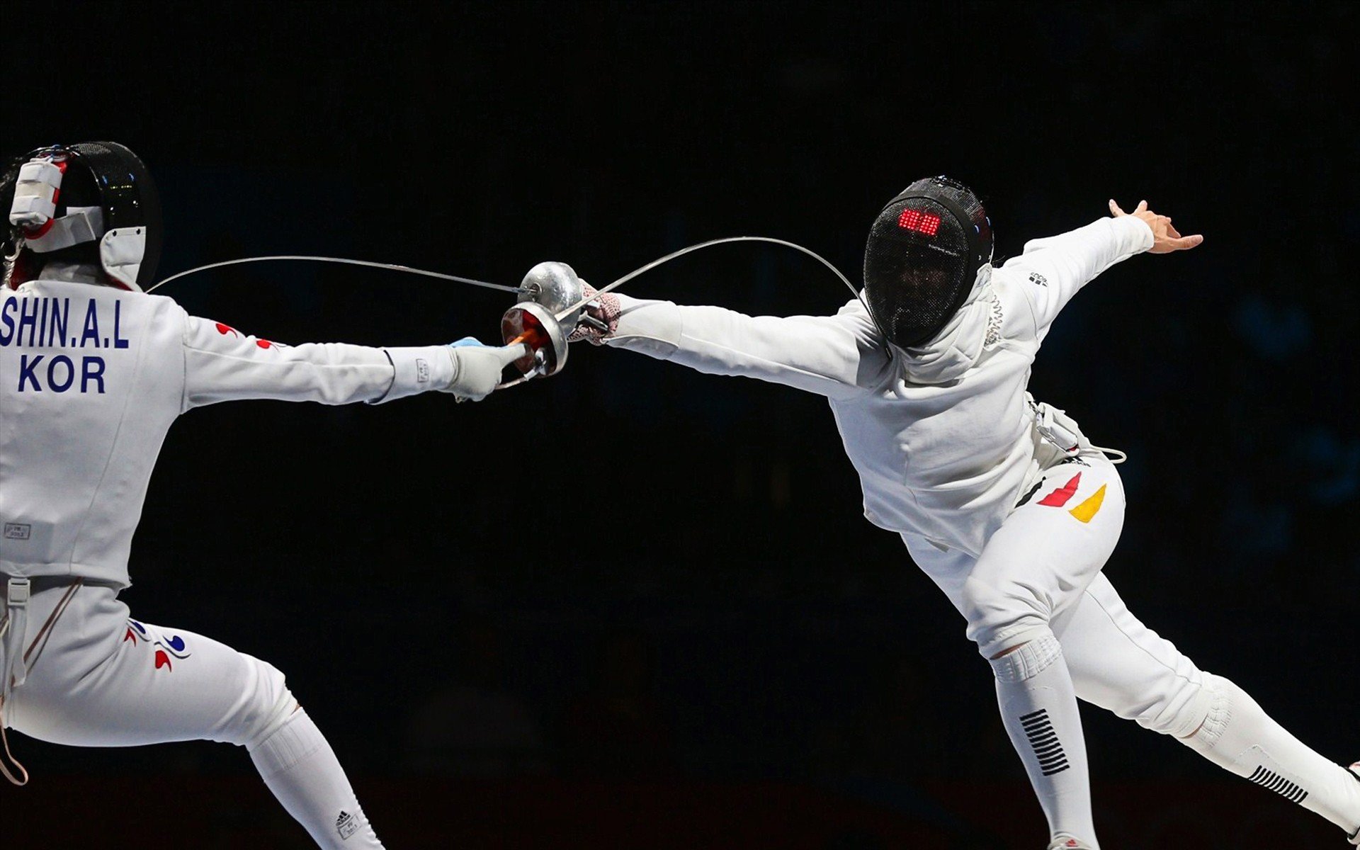 Description: Two men in white fencing suits are fighting each other with their hands in the air while one man in a black helmet holds his arm out.
