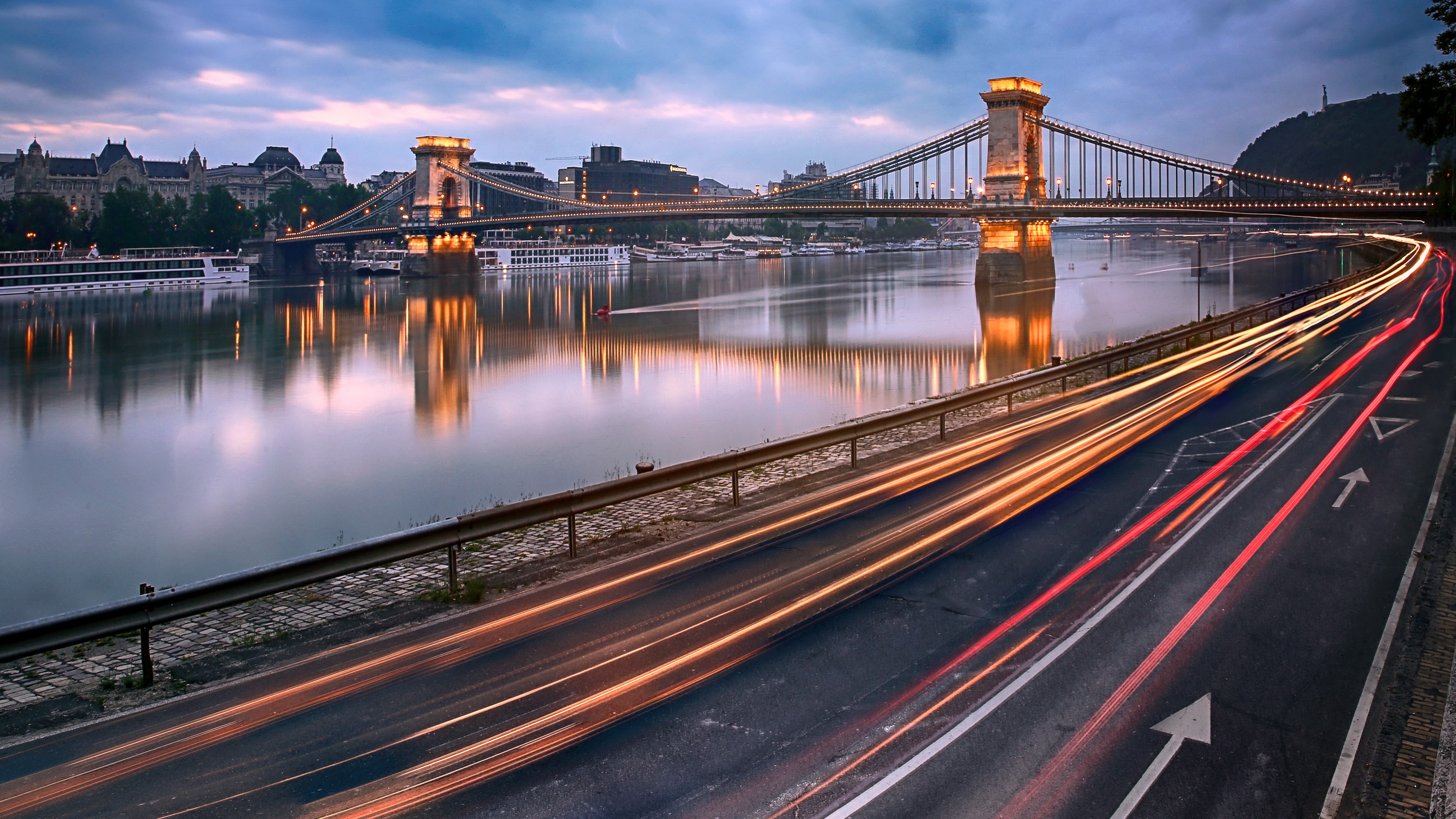 Description: A bridge over a river with a city in the background at night time with lights streaking across the road.