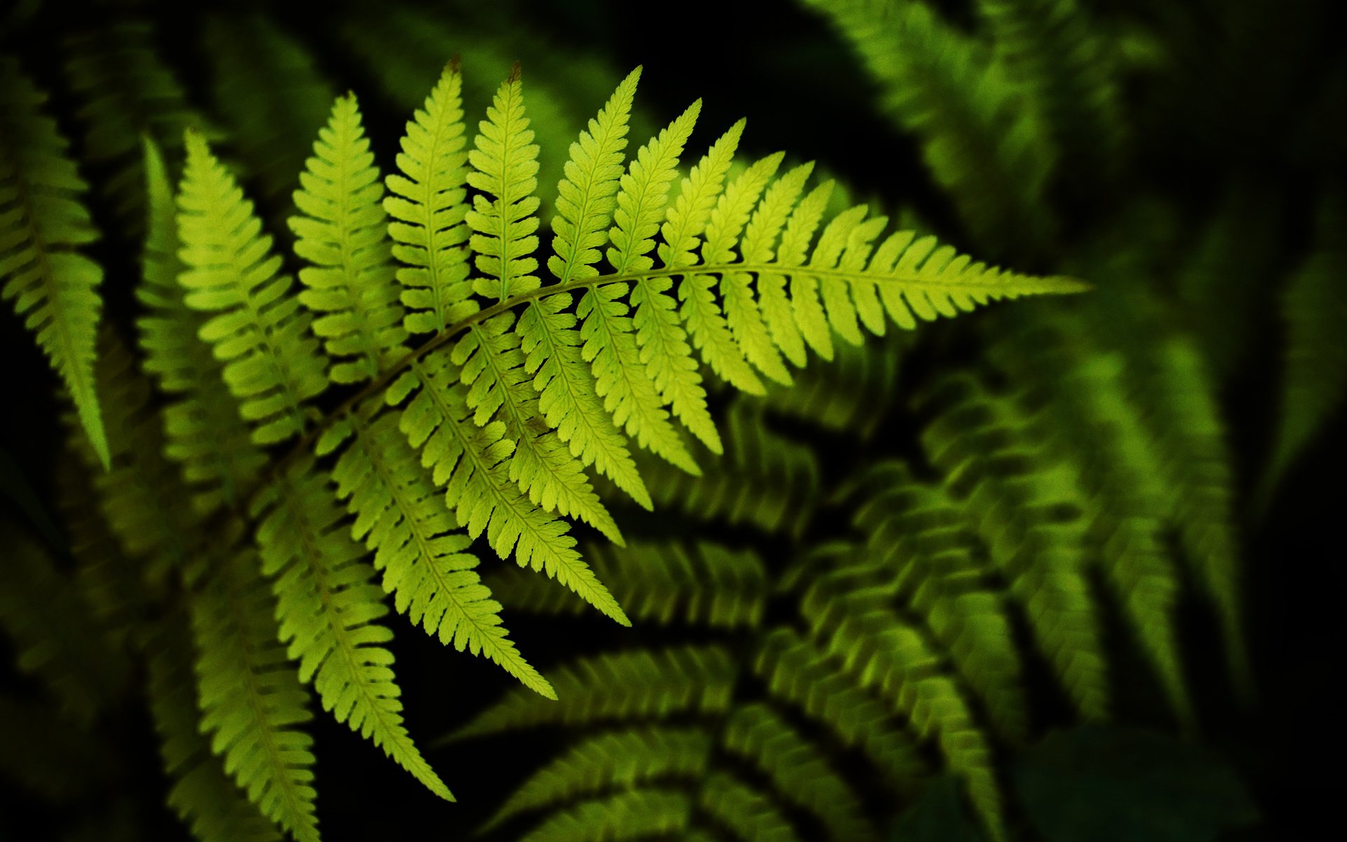 Description: A close up of a fern leaf with green leaves in the background and a black background with a green fern.