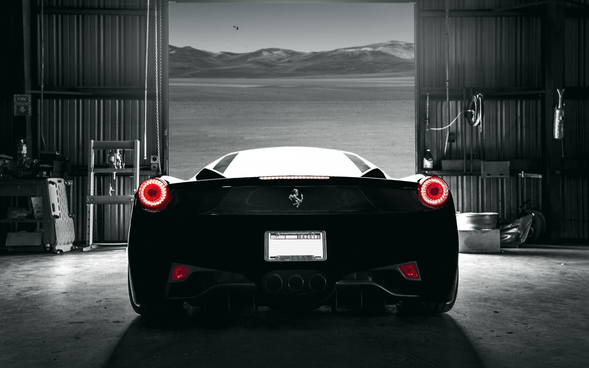 Description: A black and white photo of a ferrari in a garage with a view of the ocean and mountains in the distance.