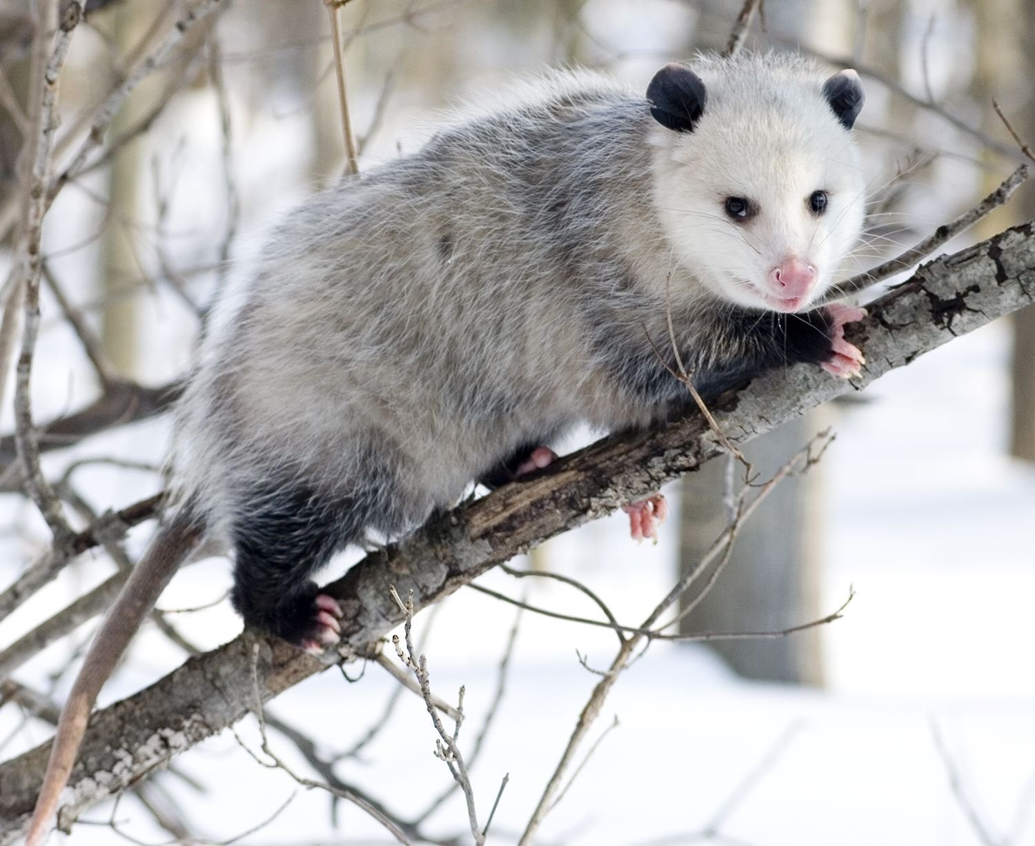 Description: A ferret is sitting on a tree branch in the snow.