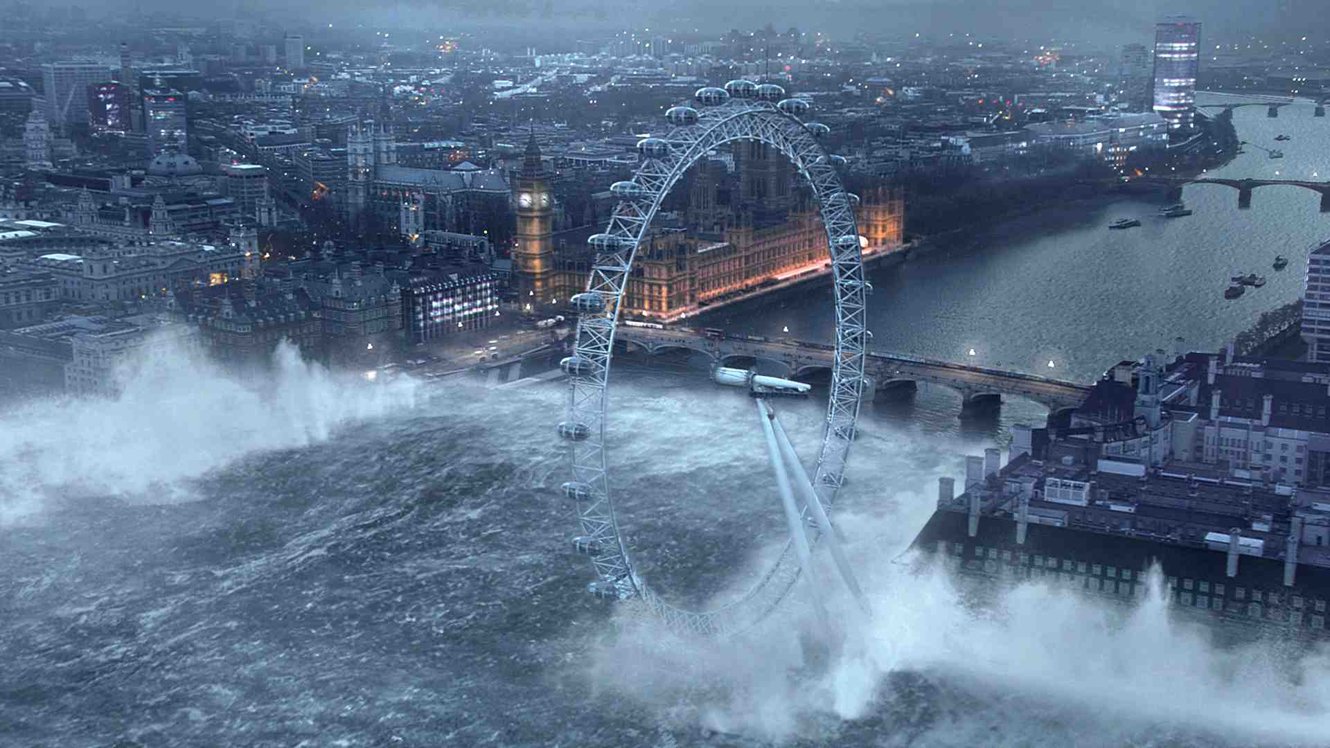 Description: A large ferris wheel in the middle of a city at night time with a large amount of water crashing around it.