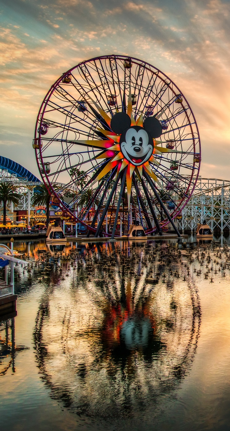 Description: A ferris wheel with a mickey mouse face on it's face in the water at a carnival park.