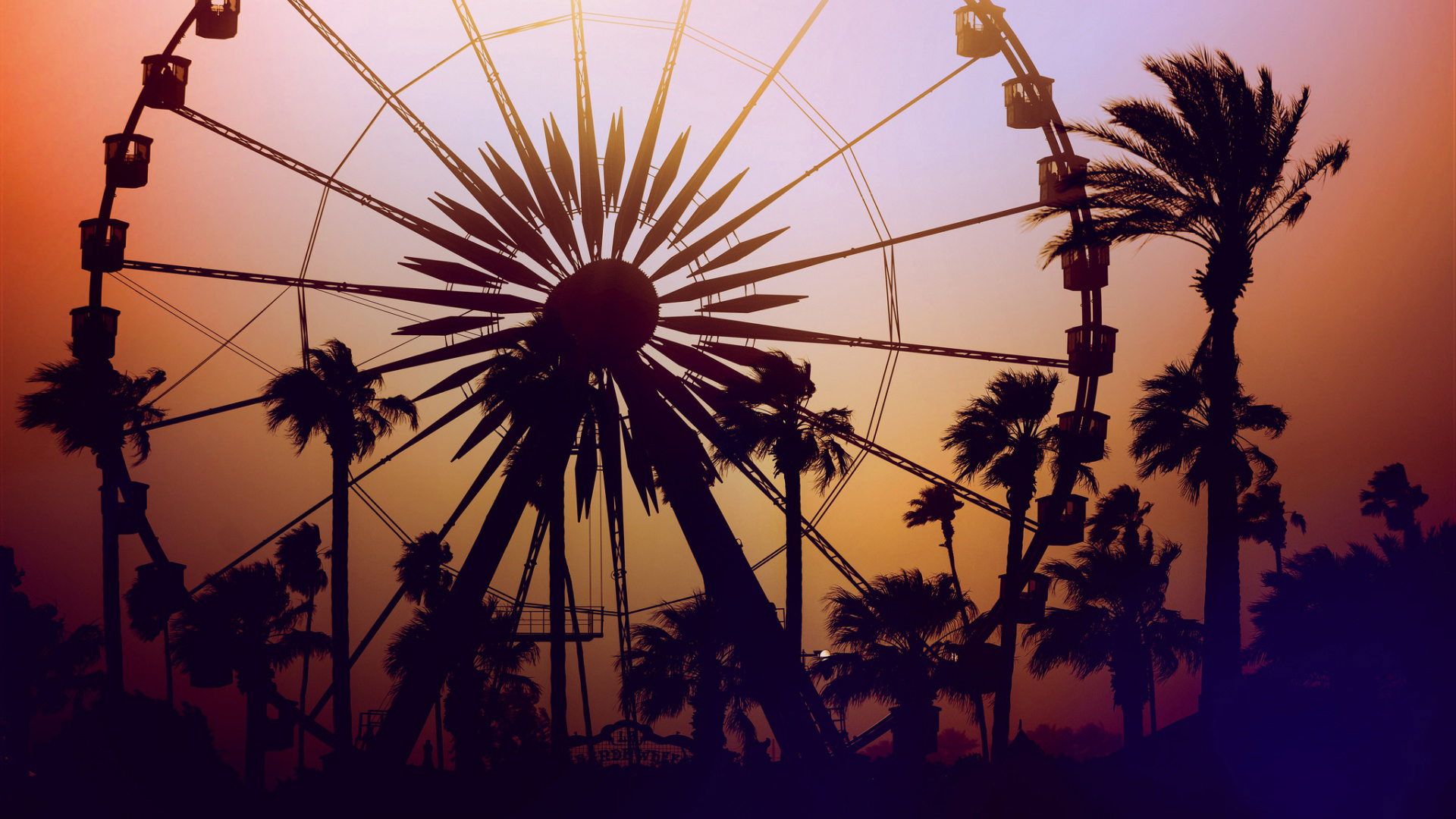 Description: A ferris wheel with palm trees in the background at sunset or dawn with a colorful sky in the background.