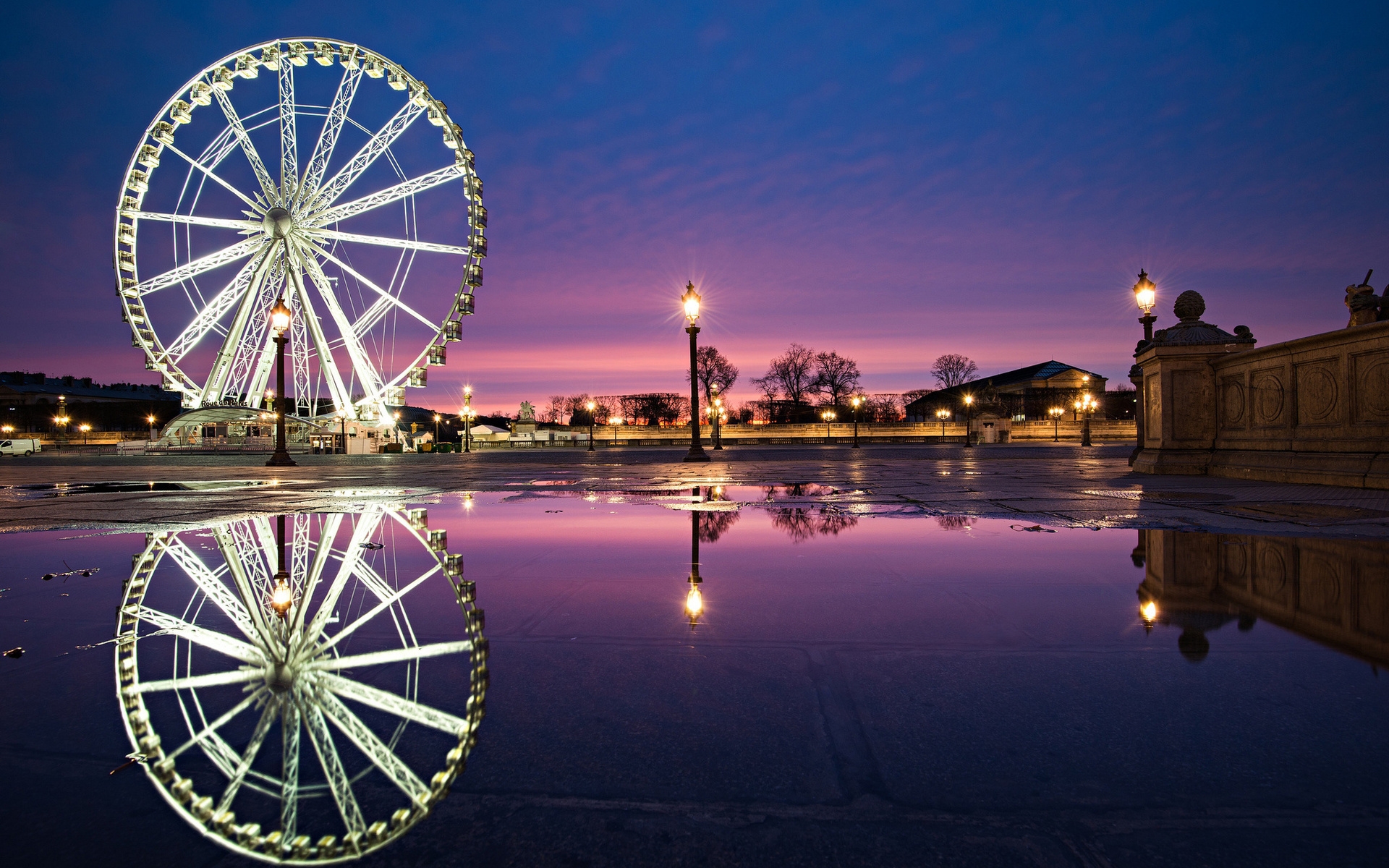 Description: A ferris wheel is reflected in a puddle at night time.