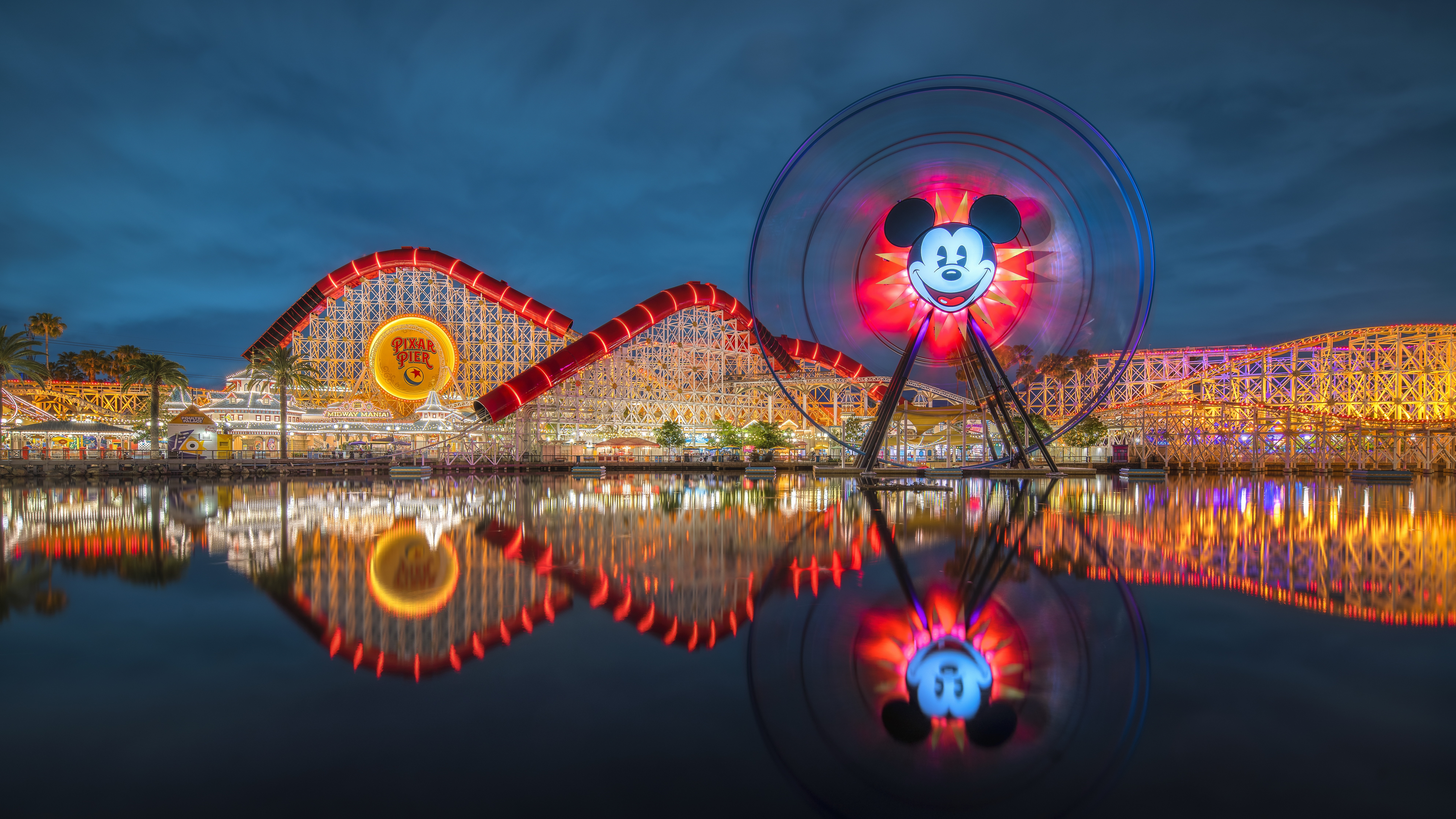 Description: A ferris wheel and a roller coaster at night time with a reflection in the water and a lit up building.