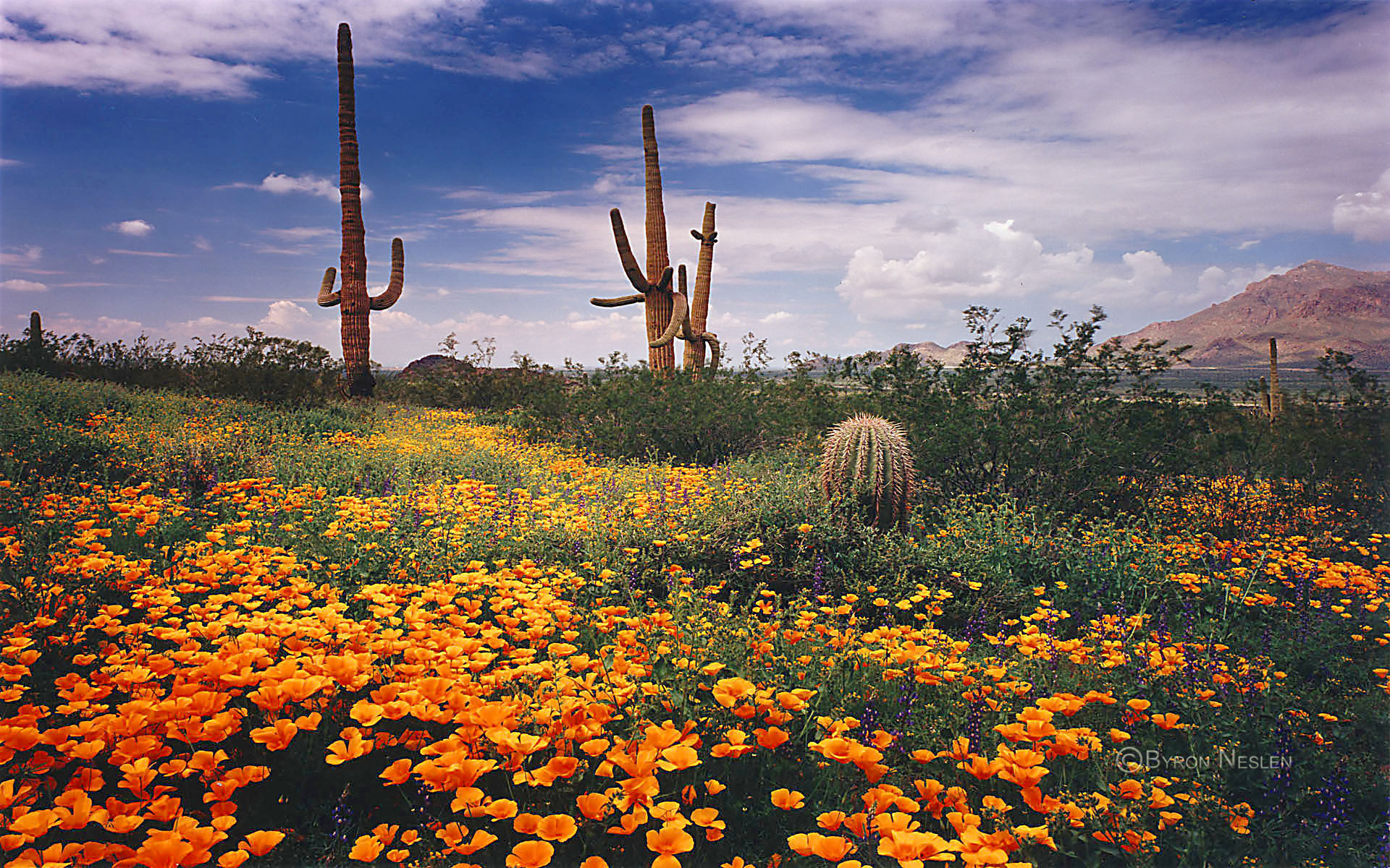 Description: A field of flowers with a cactus in the background and a sky with clouds above it and a few mountains in the distance.