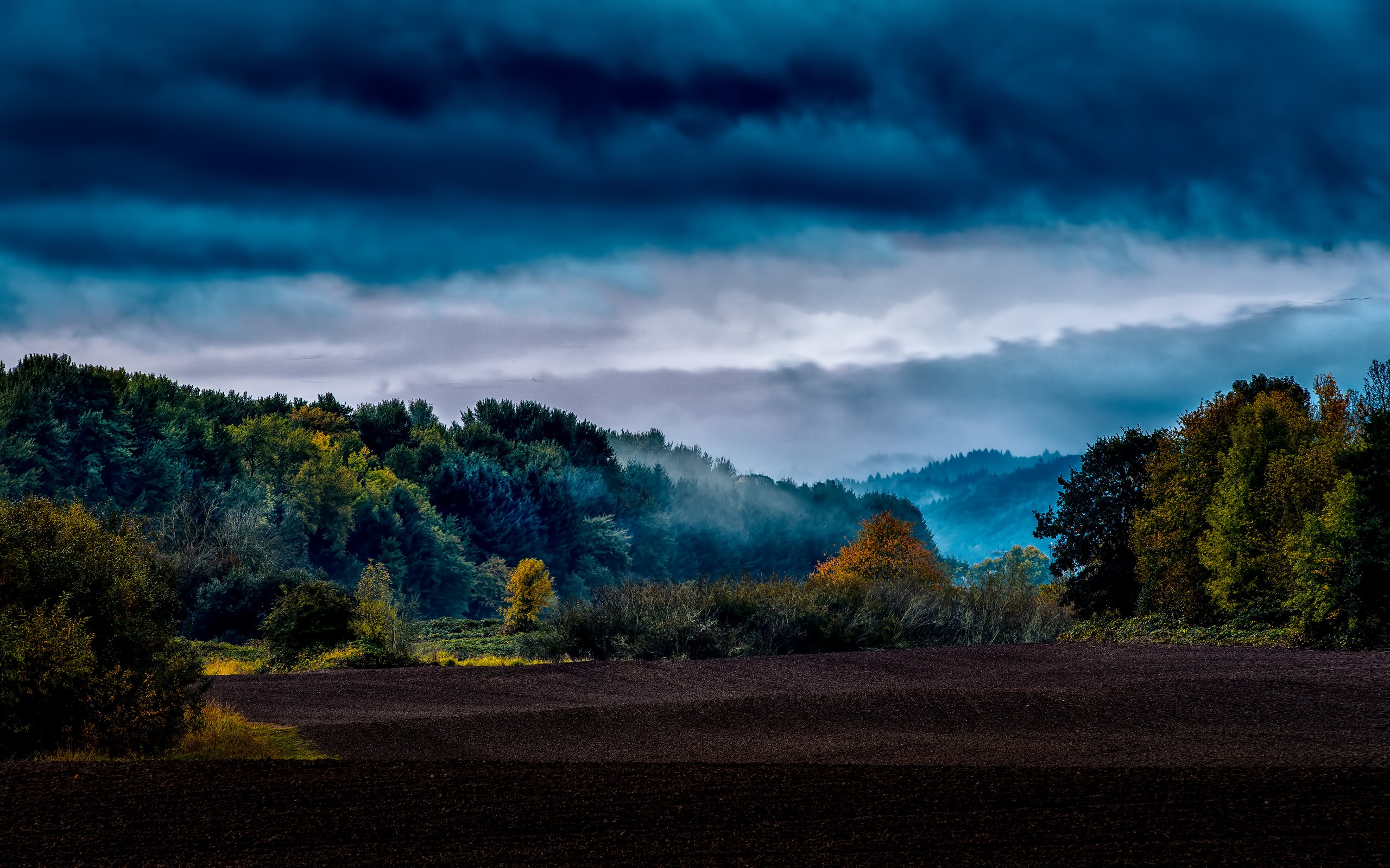 Description: A field with a forest in the background under a cloudy sky with a few clouds in the distance.