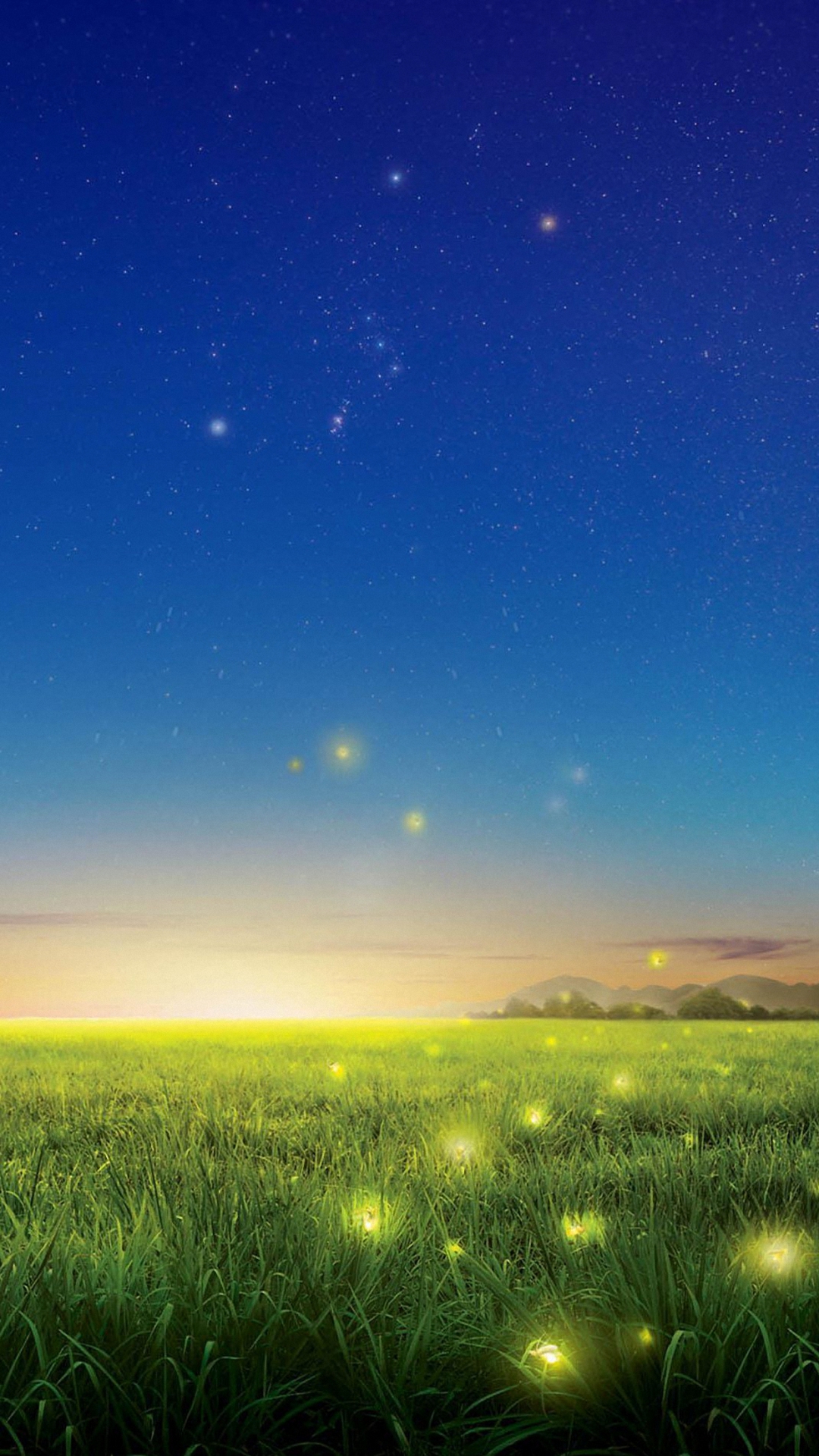Description: A field with grass and fireflies in the sky at night time with stars in the sky above it.
