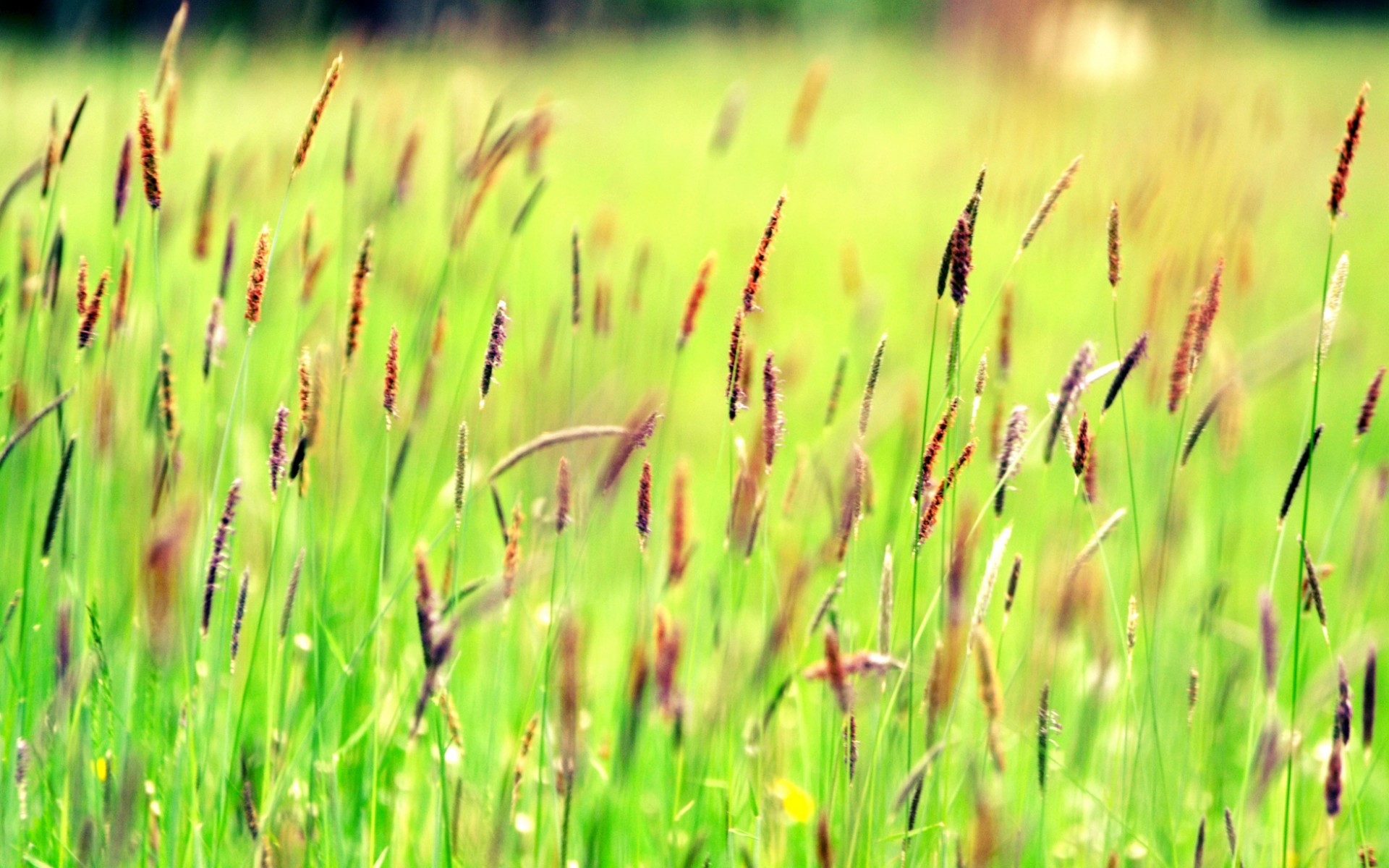 Description: A field of grass with some brown and green flowers in the foreground and a blurry background of the grass.