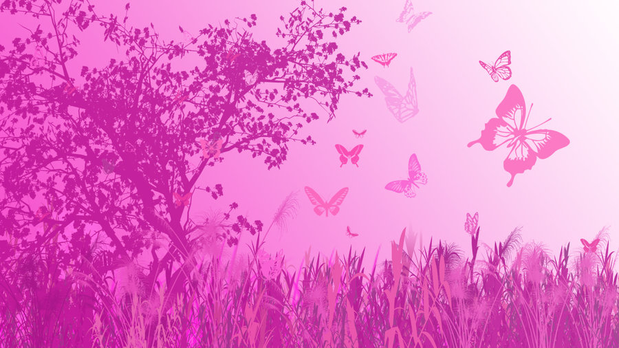 Description: A field of grass with a tree and butterflies flying over it in the sky above it is a pink background.