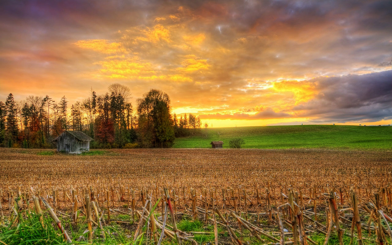 Description: A field with a house in the distance and a sunset in the background with clouds in the sky above.