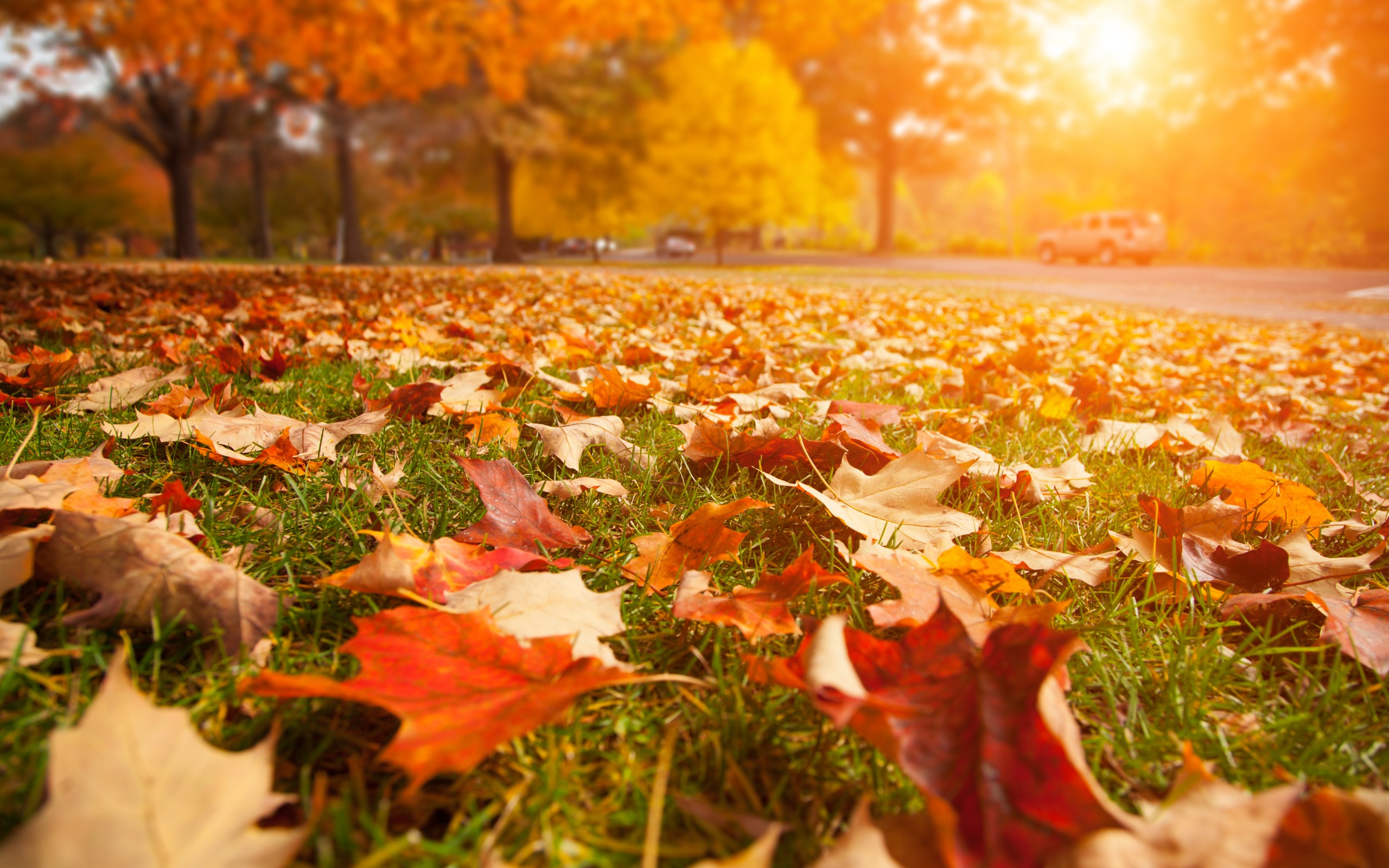 Description: A field with leaves on the ground and a street in the background with a truck parked on the road.