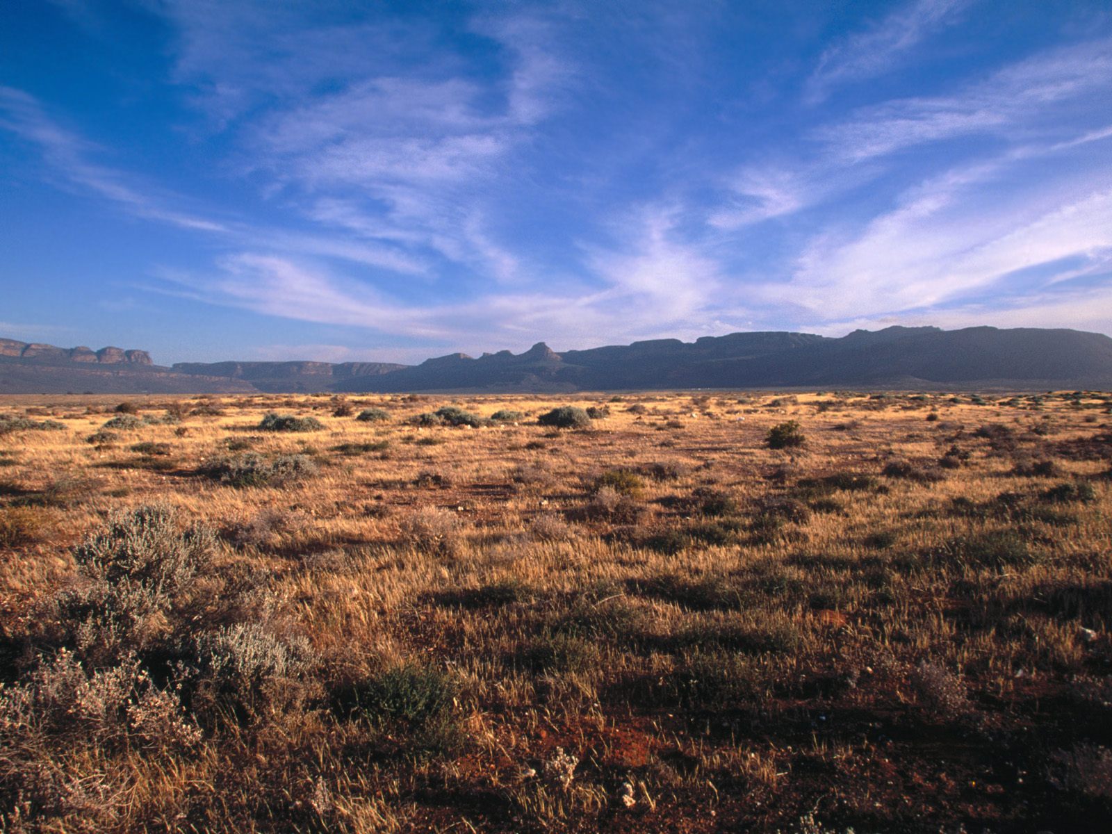 Description: A field with a mountain in the background and a blue sky with clouds above it and a few bushes in the foreground.