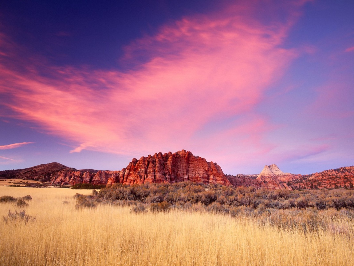 Description: A field with a mountain in the background and a pink sky above it with clouds in the distance and a few bushes in the foreground.