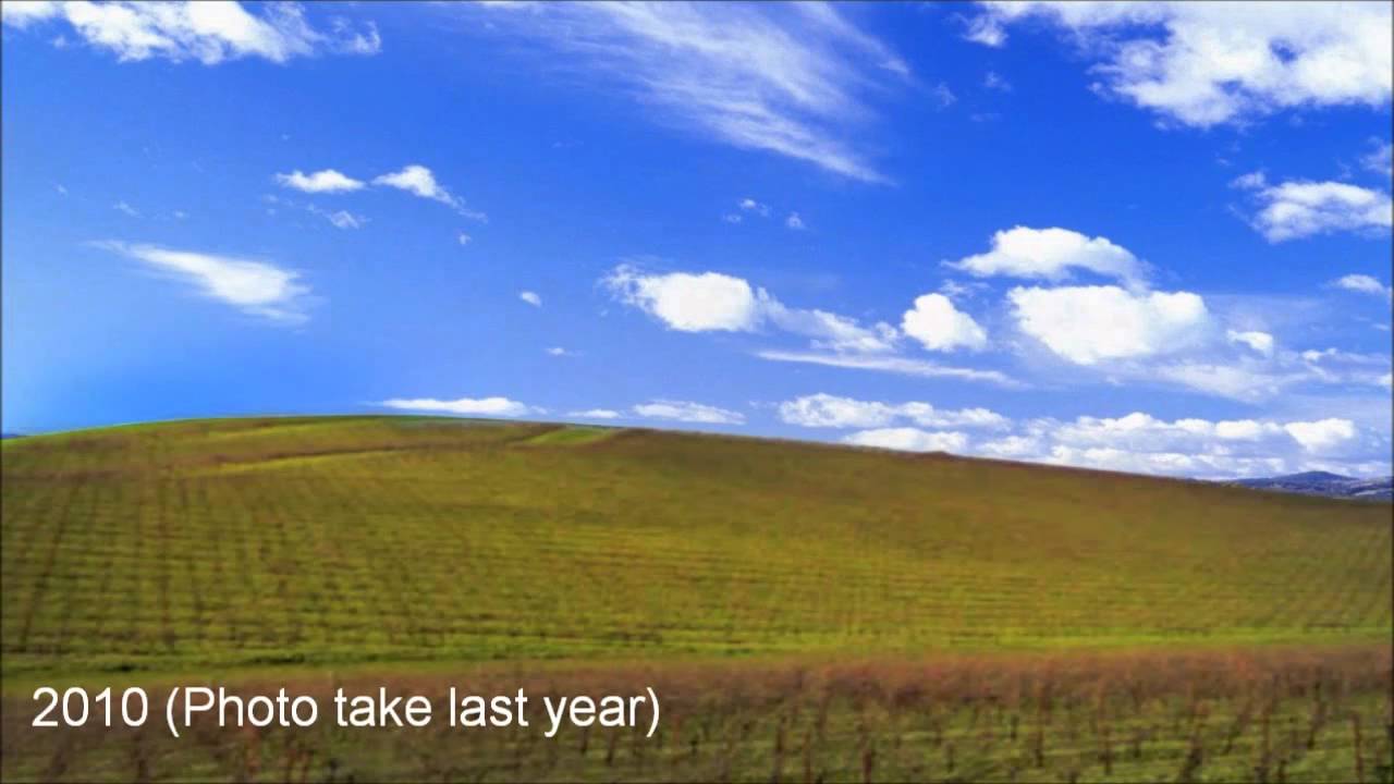 Description: A field with a sky background and clouds above it that says 2010 photo take last year on the picture.