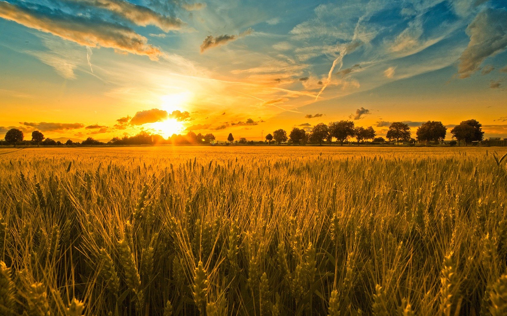 Description: A field of grass with the sun setting in the background and clouds in the sky above it.