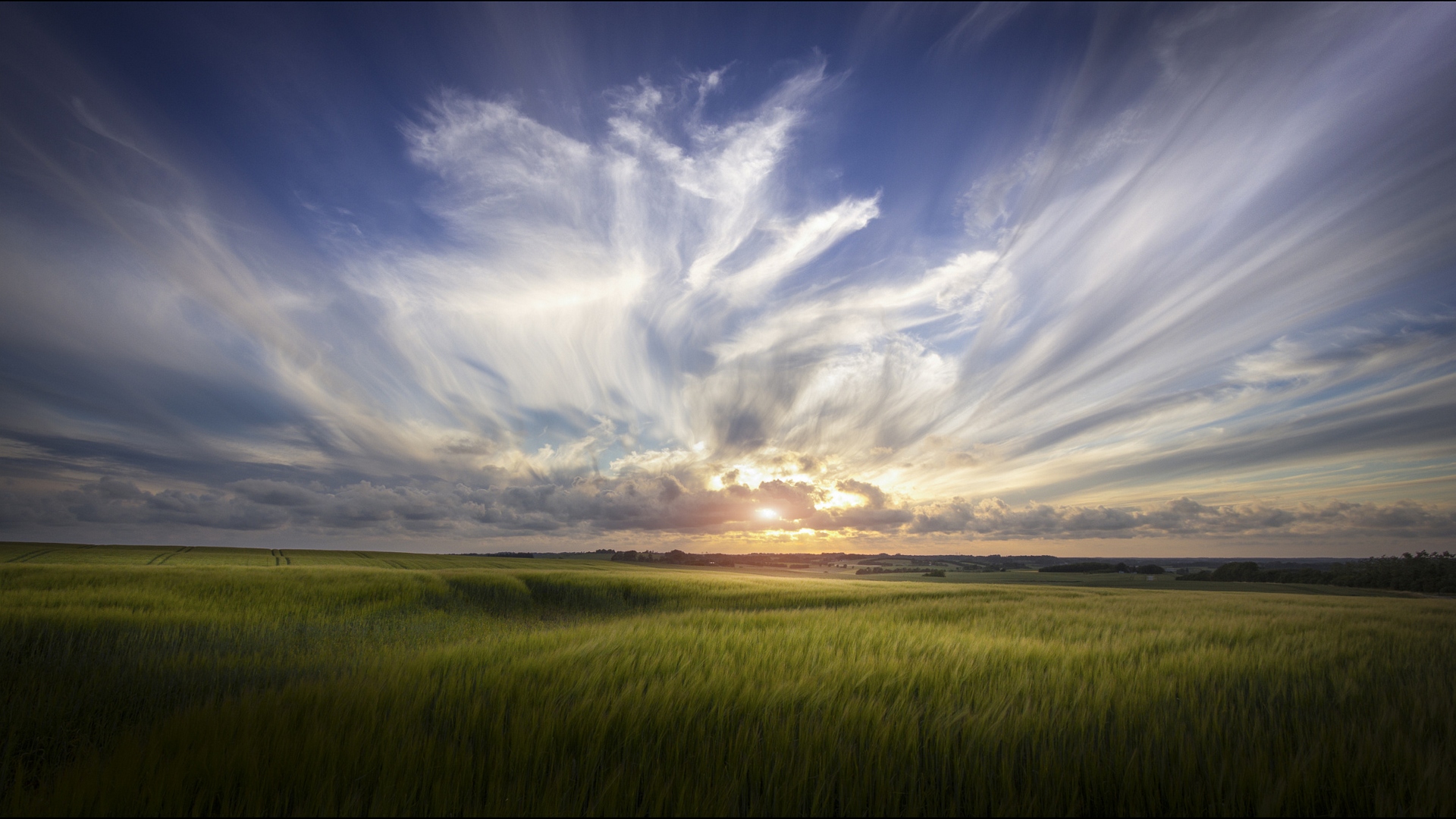 Description: A field of grass with the sun shining through the clouds in the distance with a blue sky above it.