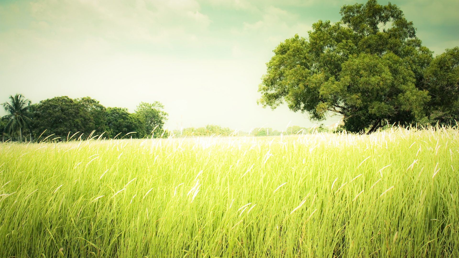 Description: A field of tall grass with a tree in the background and a sky background with clouds in the distance.