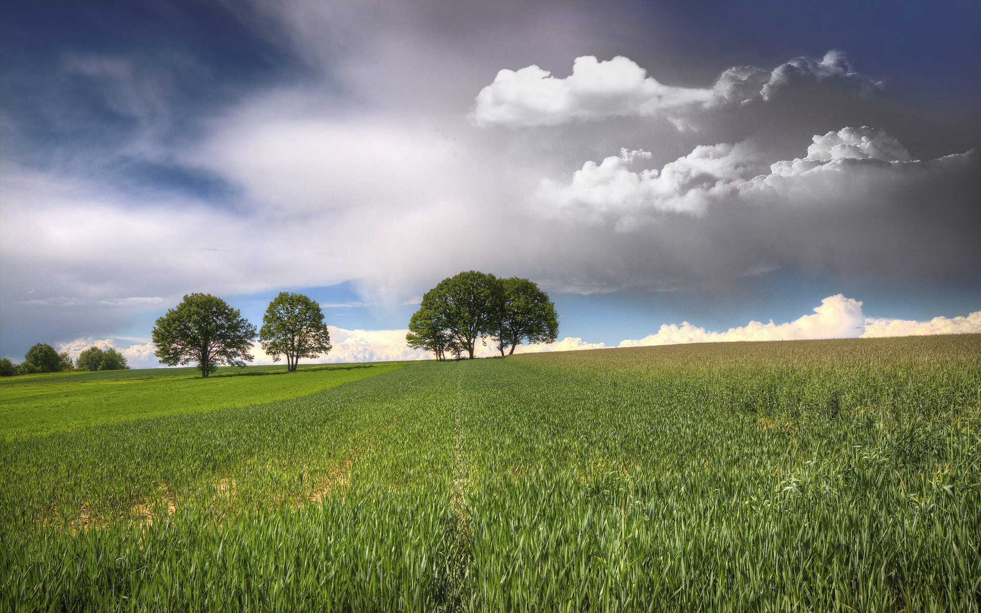 Description: A field with trees and clouds in the background and a blue sky with clouds above it and a few green trees.