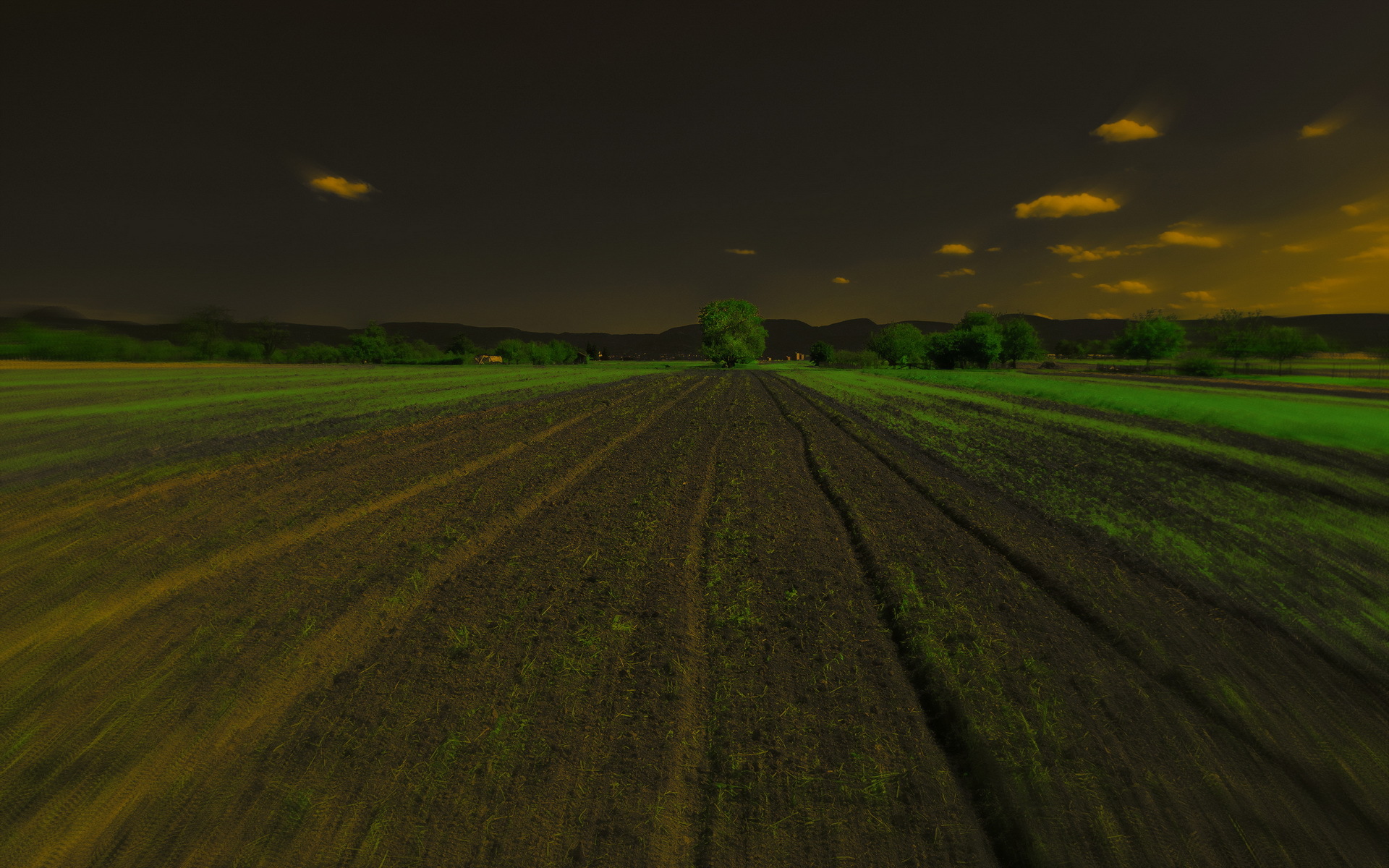 Description: A field with a few trees in the distance and a dark sky in the background with clouds in the distance.