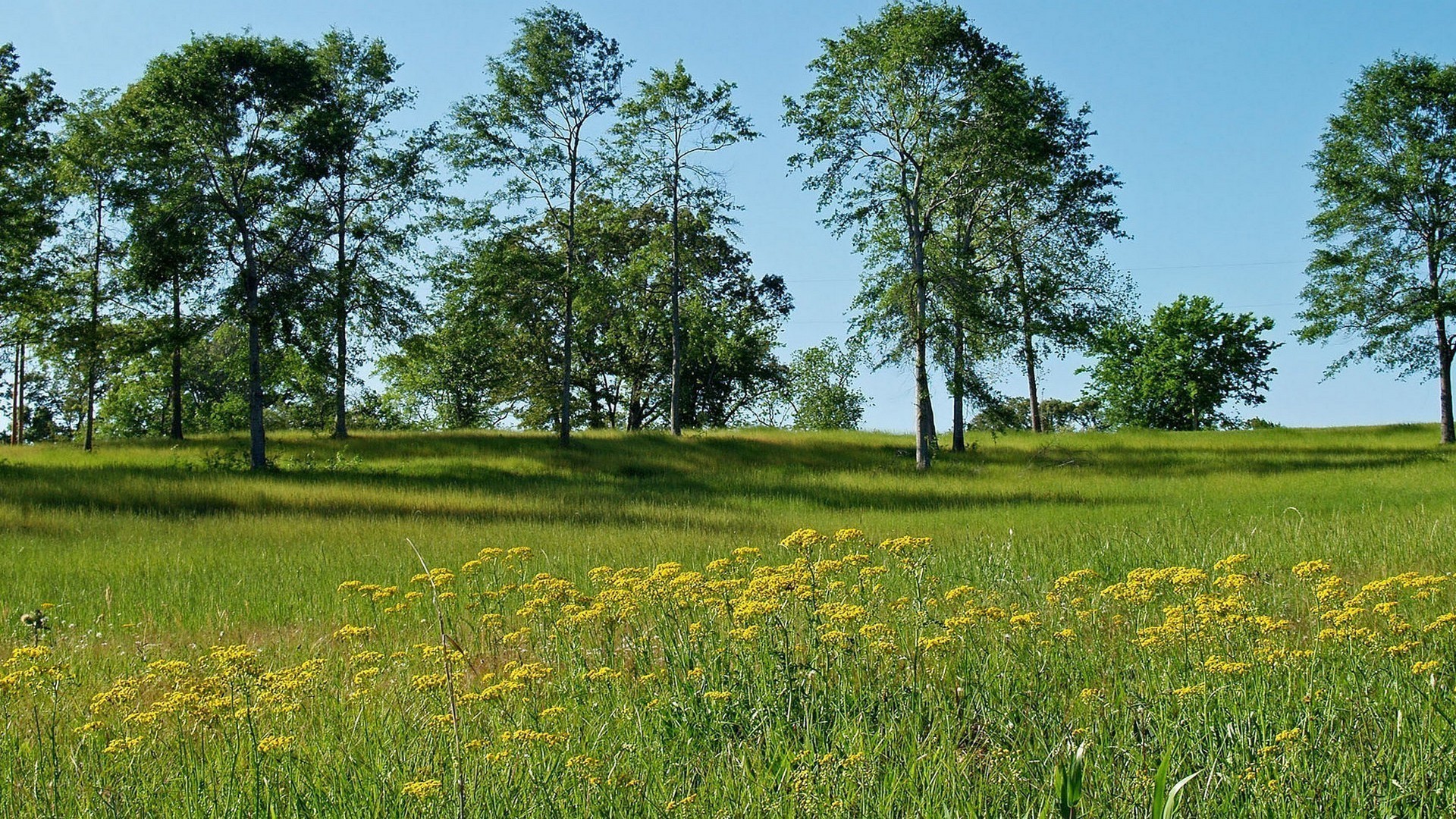Description: A field with trees and grass in the background and a blue sky in the background with a few clouds.