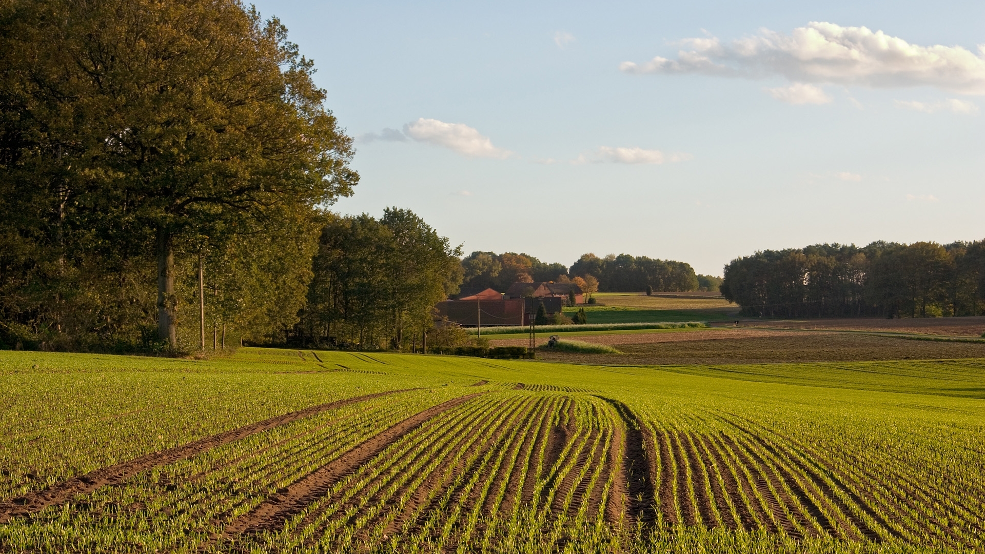 Description: A field with a row of trees in the distance and a house in the distance in the distance.
