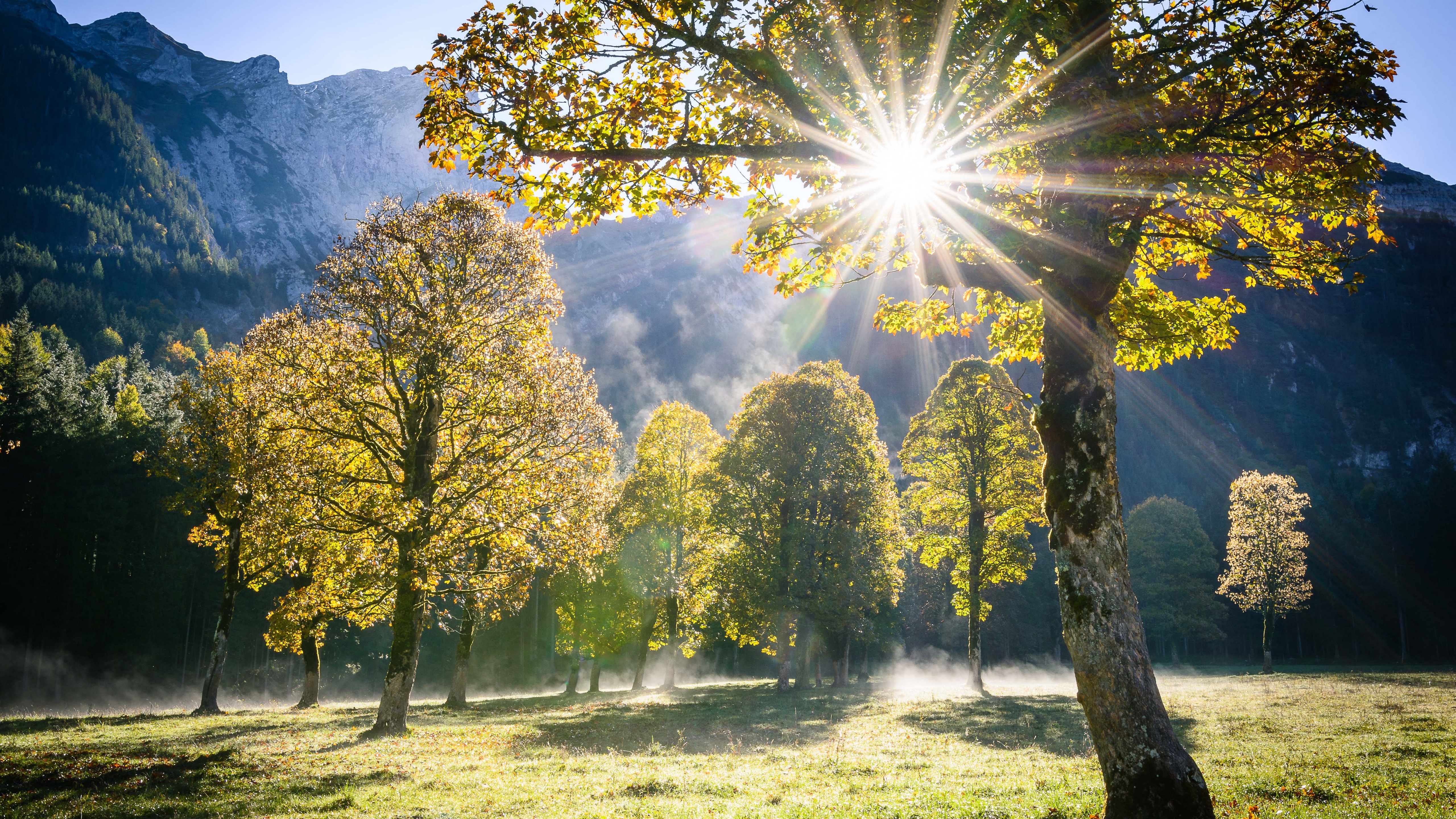 Description: A field with trees and a sun shining through the trees in the background with mountains in the background and fog in the air.