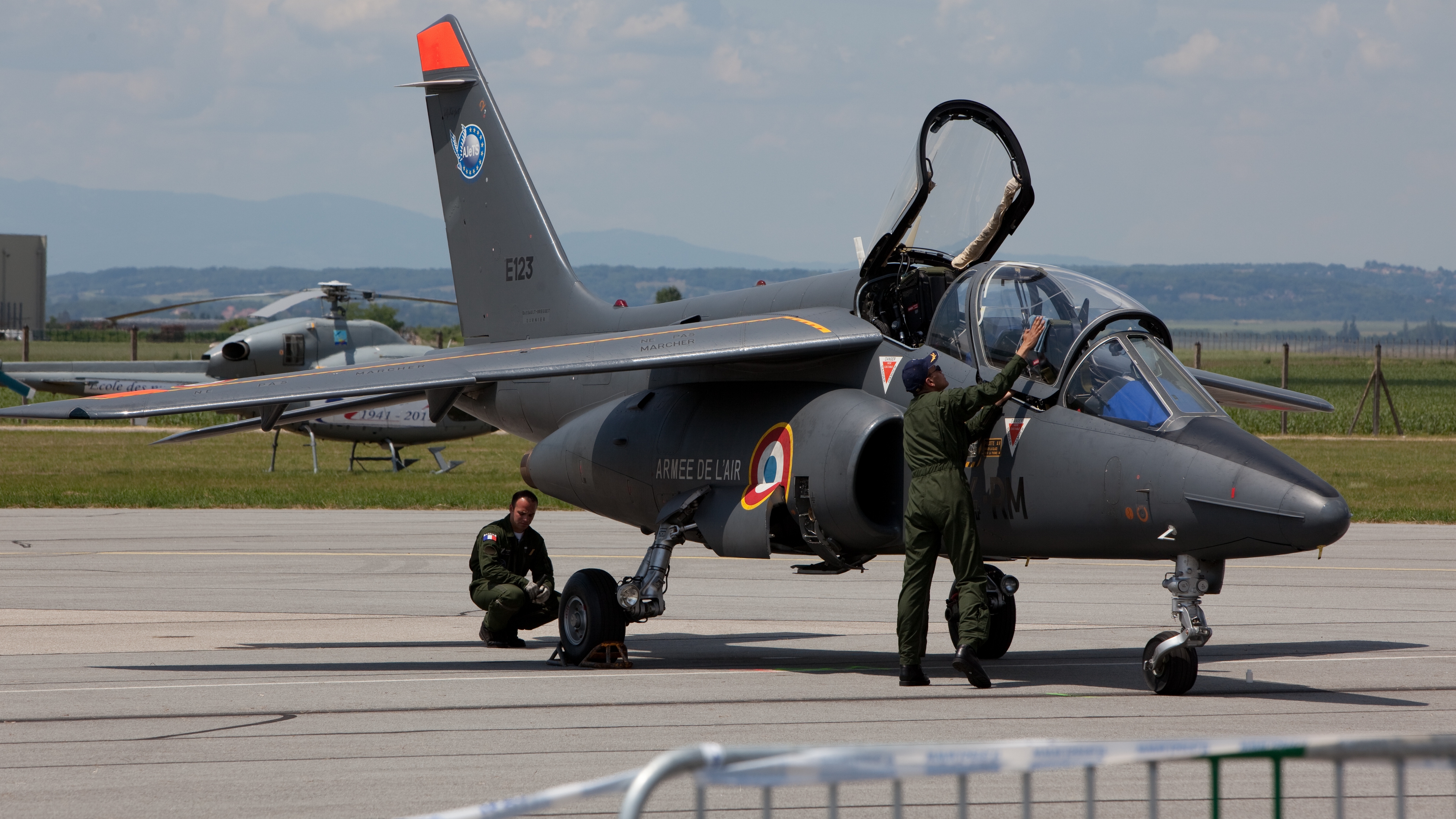 Description: A fighter jet sitting on top of an airport tarmac next to a man in a green uniform standing next to it.
