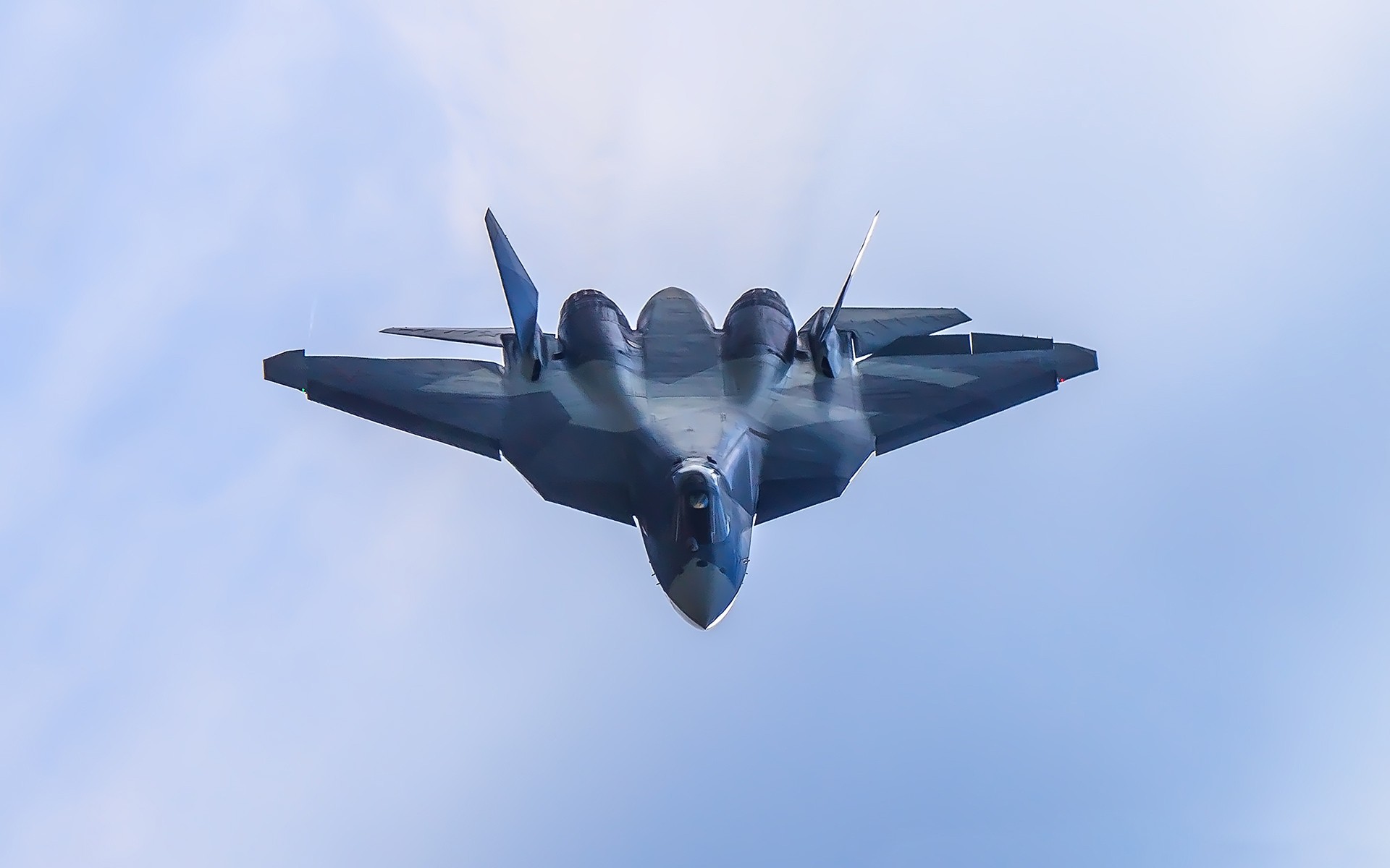 Description: A fighter jet flying through a blue sky with clouds in the background and a sunbeam in the middle of the wing.