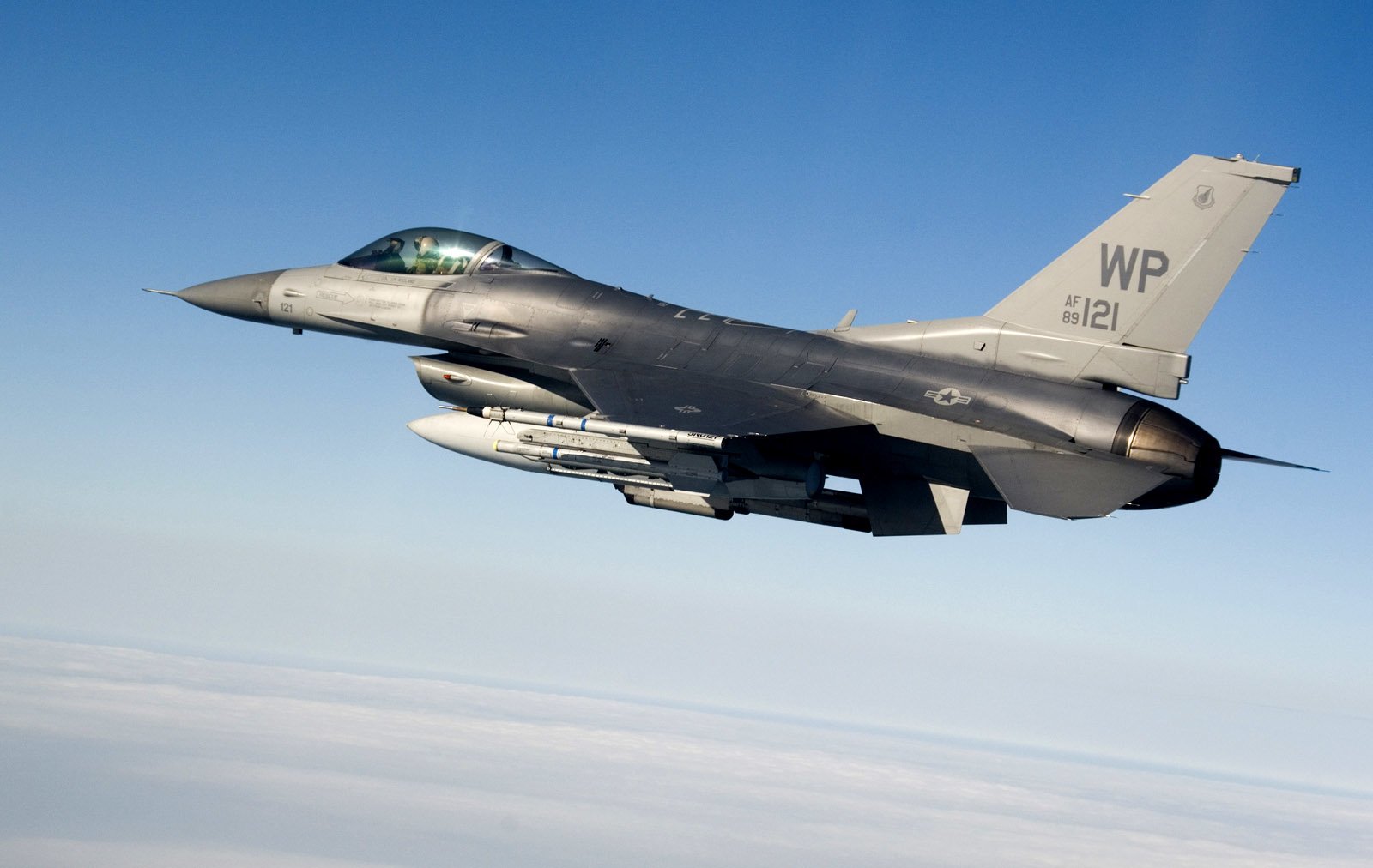 Description: A fighter jet flying through a blue sky above the clouds in the sky with a word written on the side of the jet.