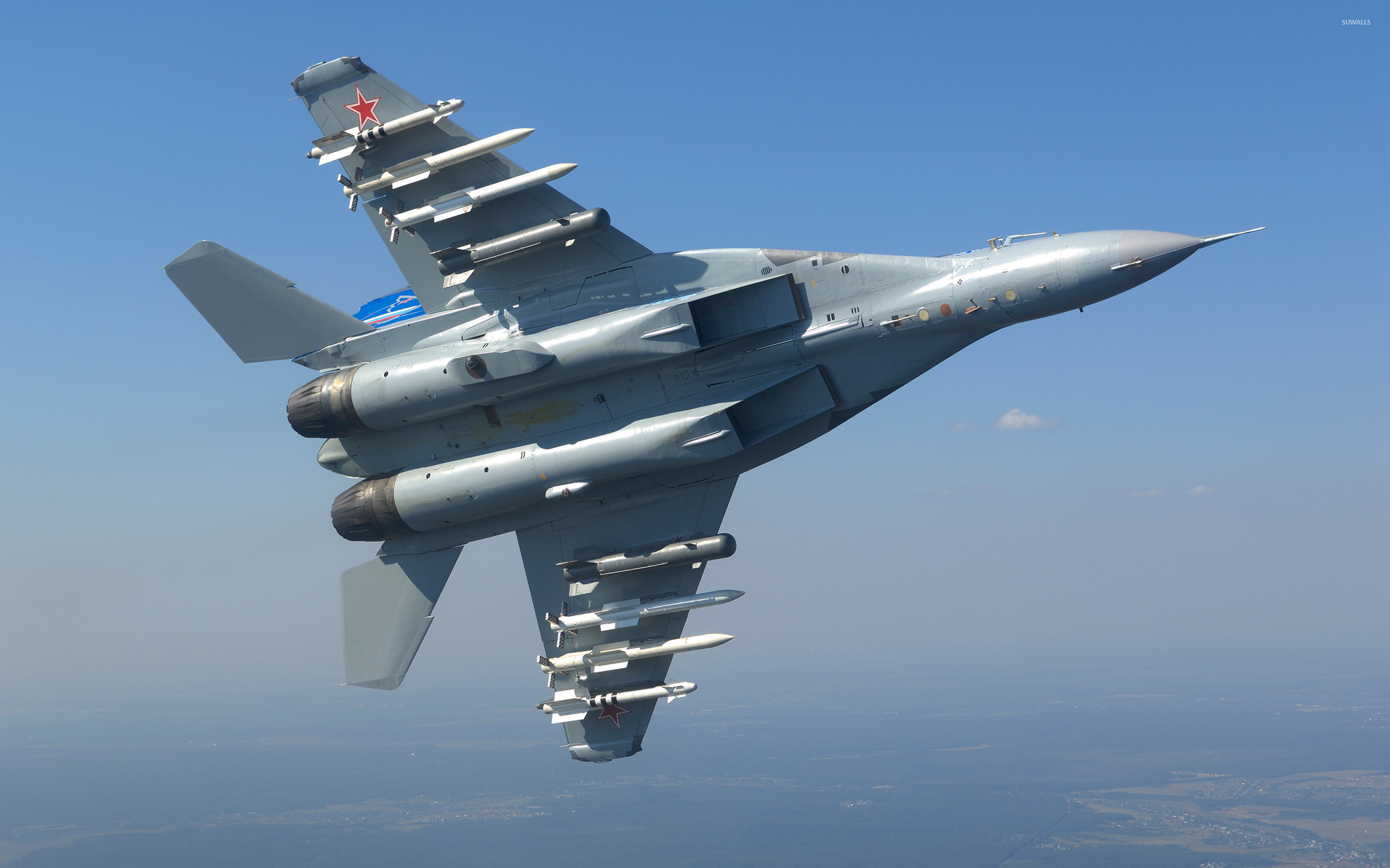 Description: A fighter jet flying through a blue sky with a few clouds in the background and a few clouds in the sky.