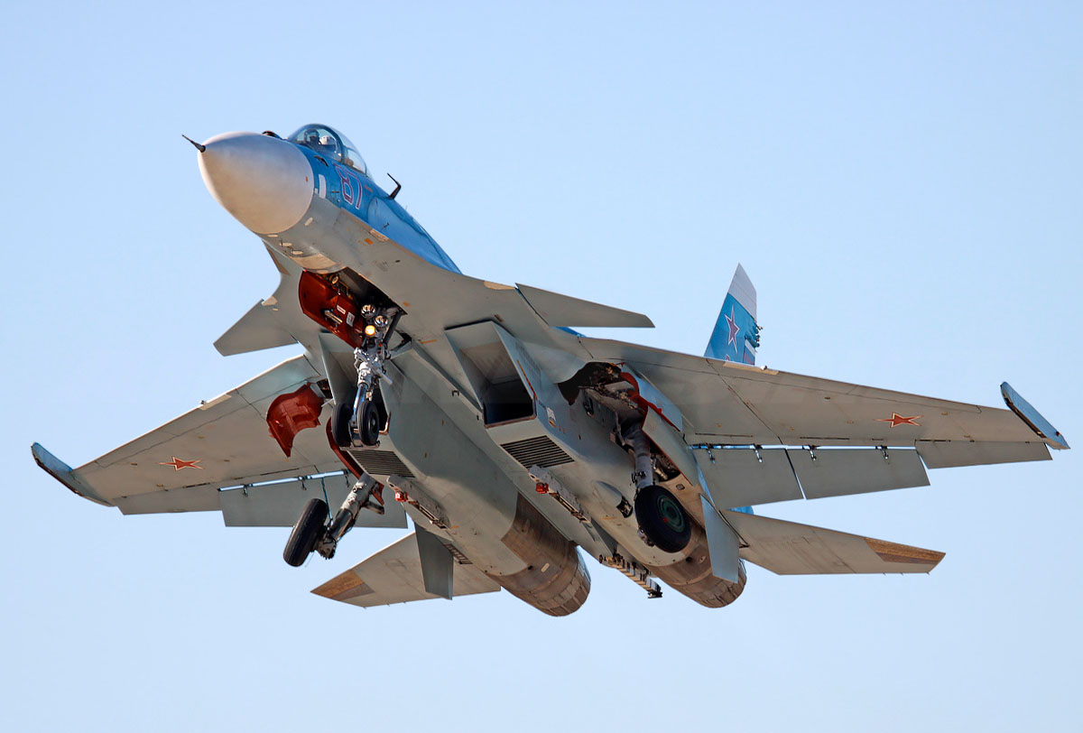 Description: A fighter jet flying through a blue sky with a person inside of it's cockpit window looking down.