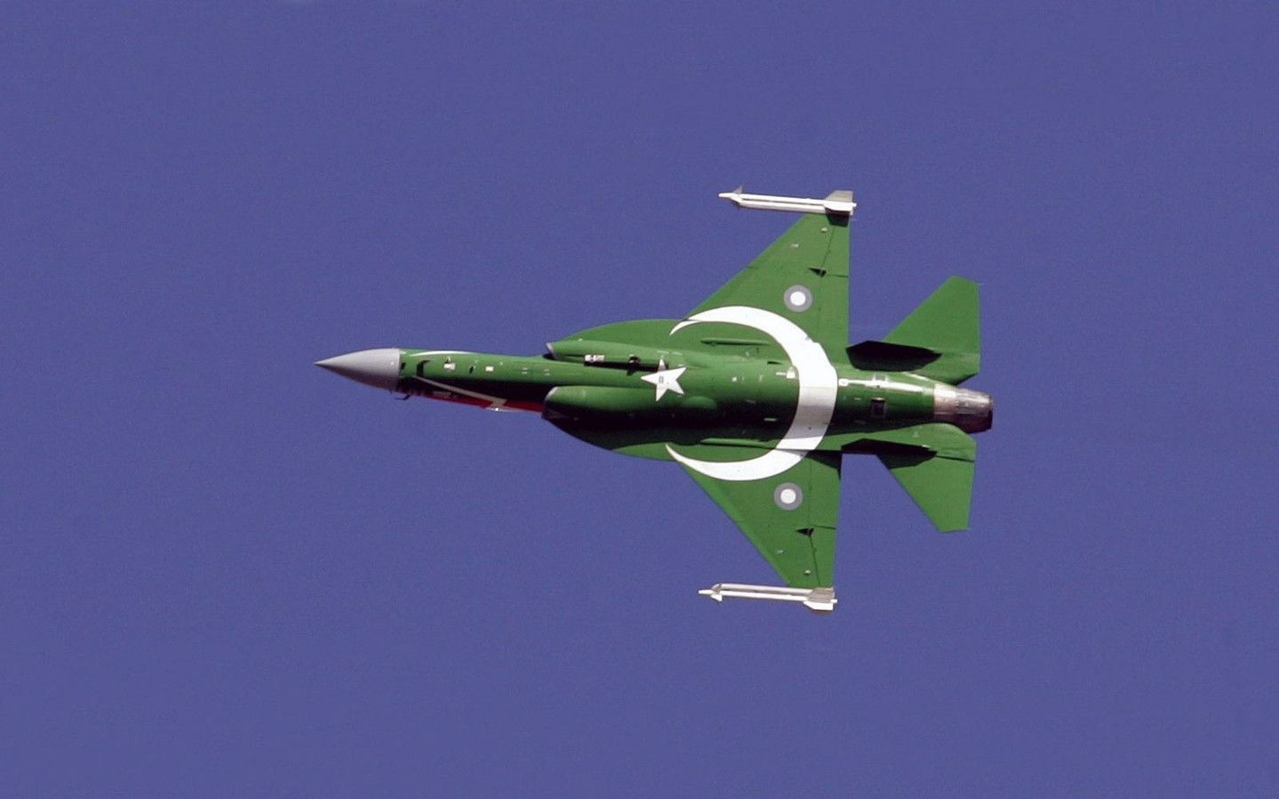 Description: A fighter jet flying through a blue sky with a crescent on it's side and a star on the side.