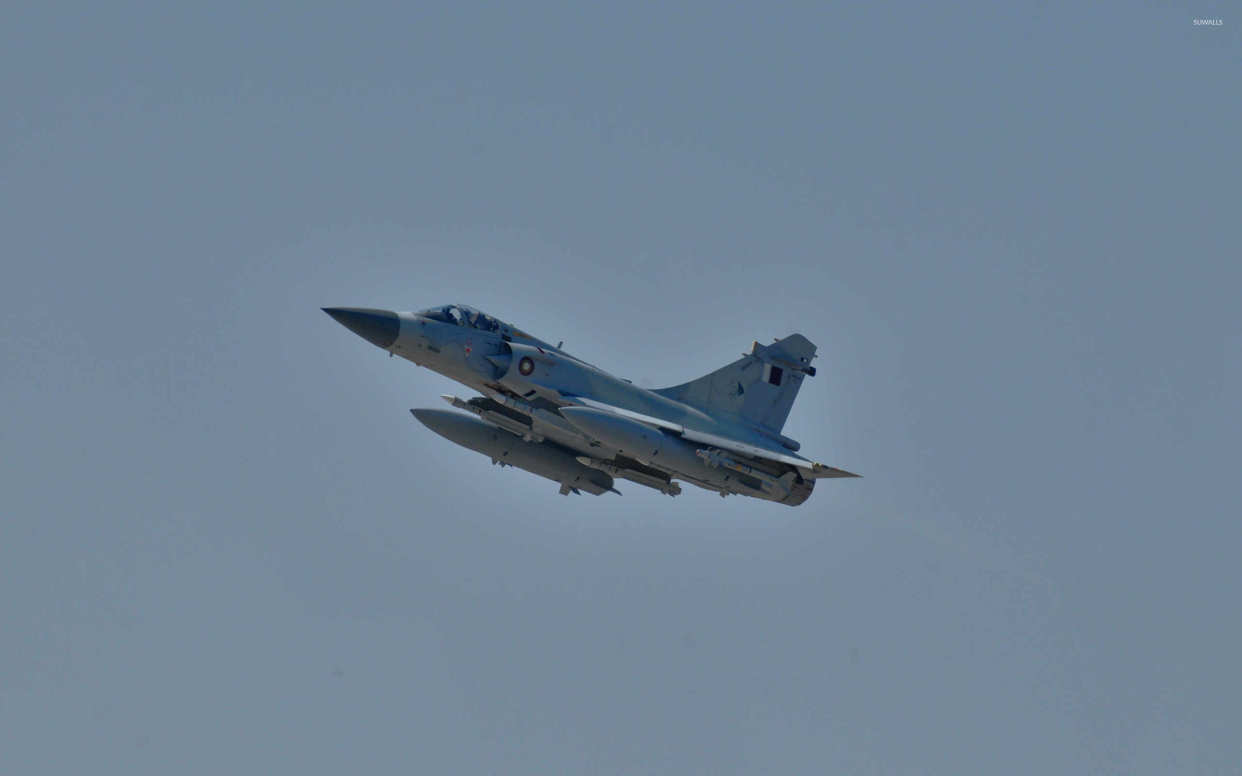 Description: A fighter jet flying through a blue sky with a landing gear down and a landing gear down on the bottom of the jet.